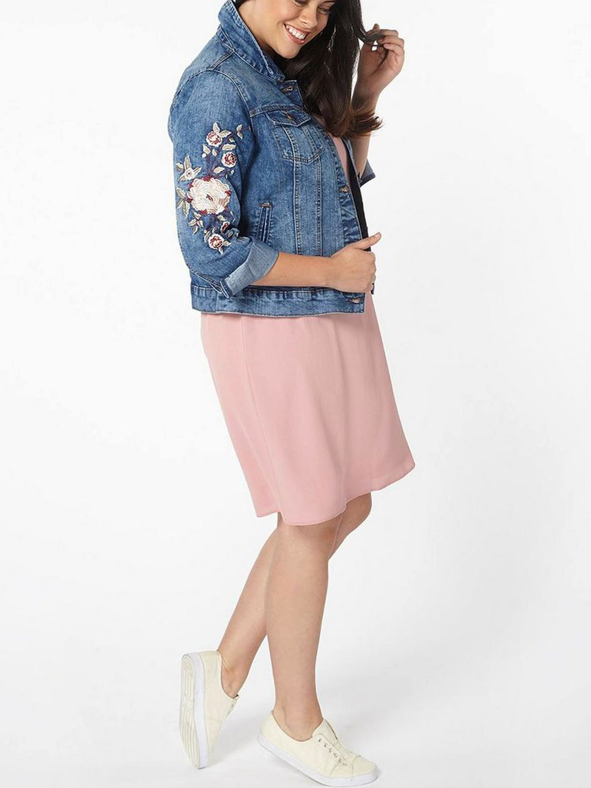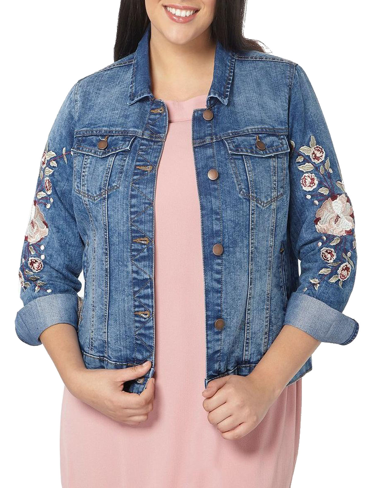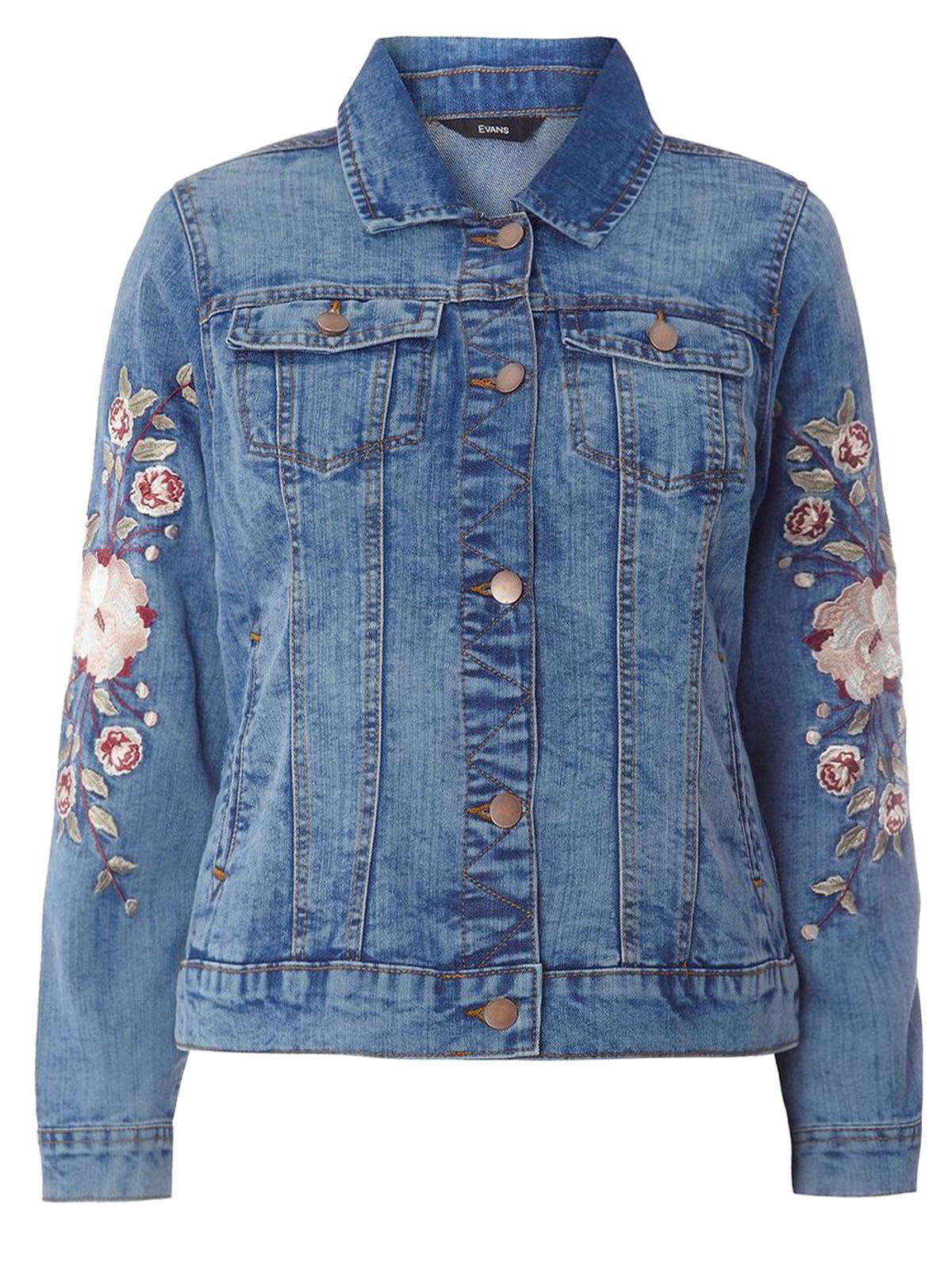 This denim blue embroidered denim jacket featuring beautiful garland of flowers embroidered along the sleeves, turn-down collar, brass button fastening to the front, deep side pockets, two buttoned flap pockets to the chest and zig-zag stitching detail to the placket. Wear with a cute dress, skirt, leggings or trousers for a complete the look. Length from approx 23in.