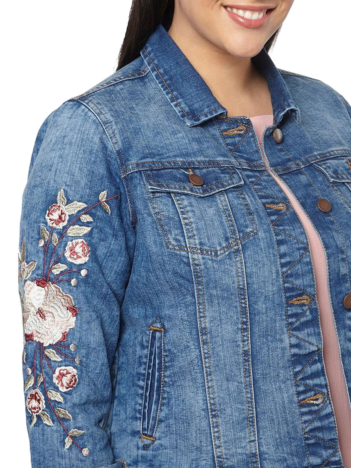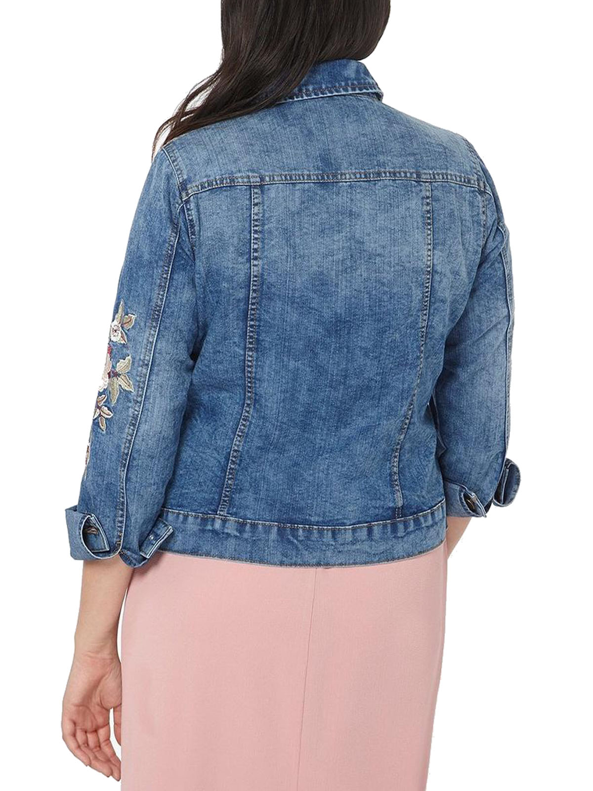 Embroidered Sleeve Short Denim Jacket - Denim Blue