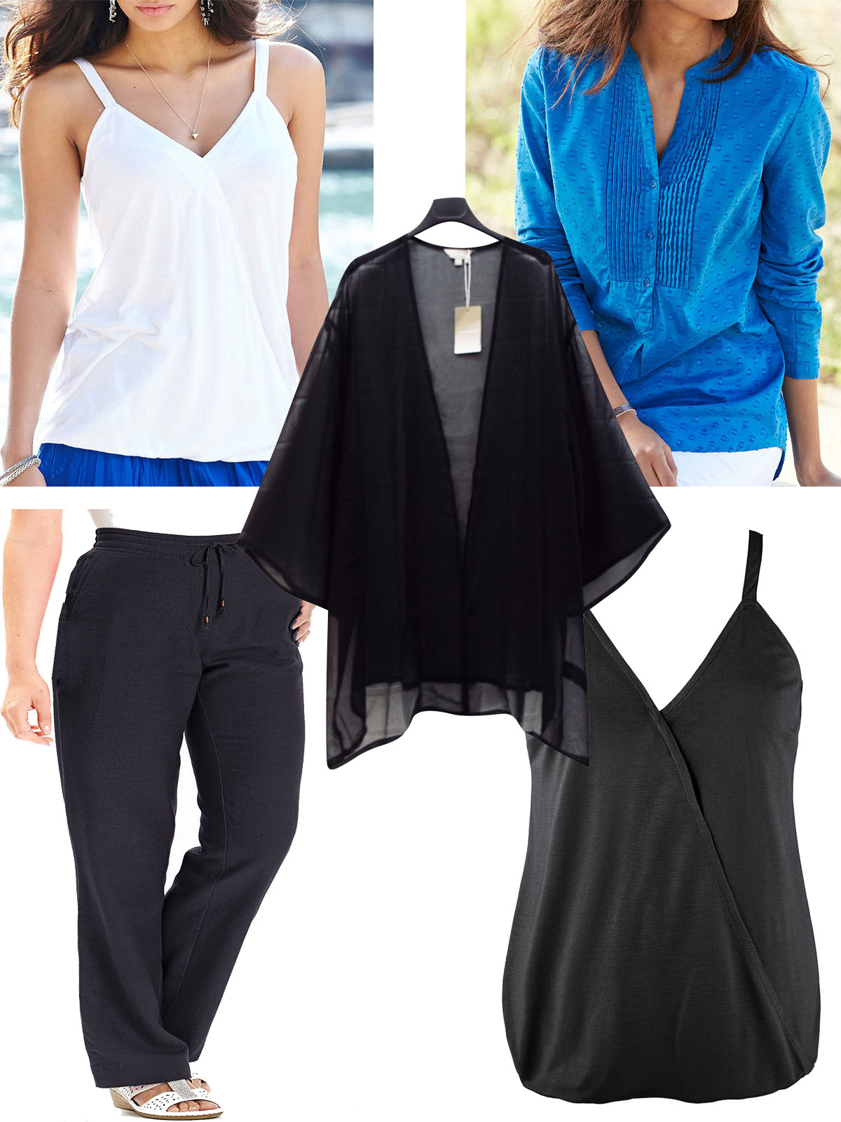 A mixed pack of ladies tops and trousers with a variety of styles and colors and lengths.