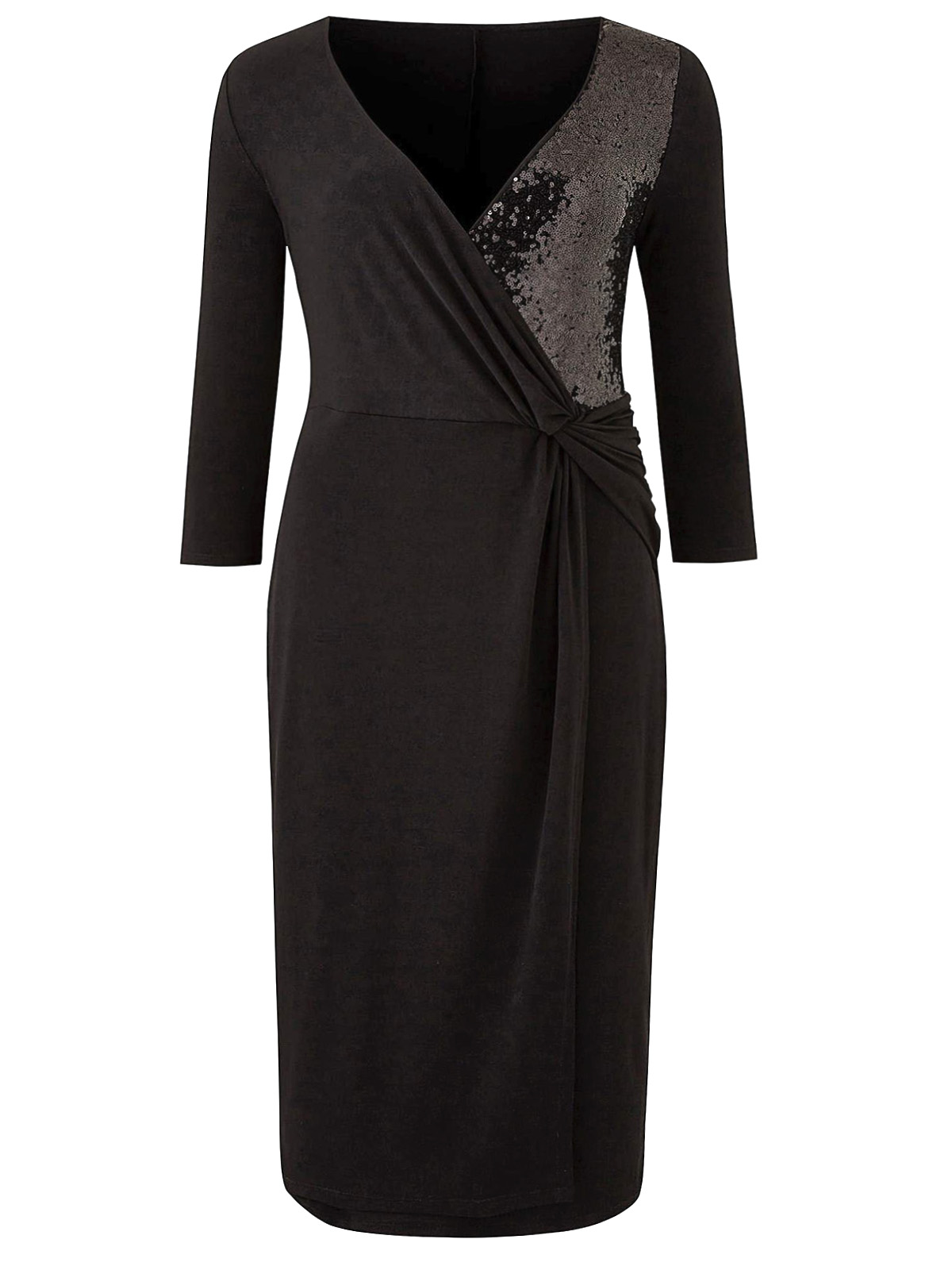 Feel beautiful in this sequin panel twist knot dress this season. In a shape that will love your curves, it features a wrap-over top with a beautiful sequin panel adding some shine to the dress. The curved hem overlaps at the skirt creating a gorgeous fit with 3/4 length sleeves to complement. Length 41in/104cm.