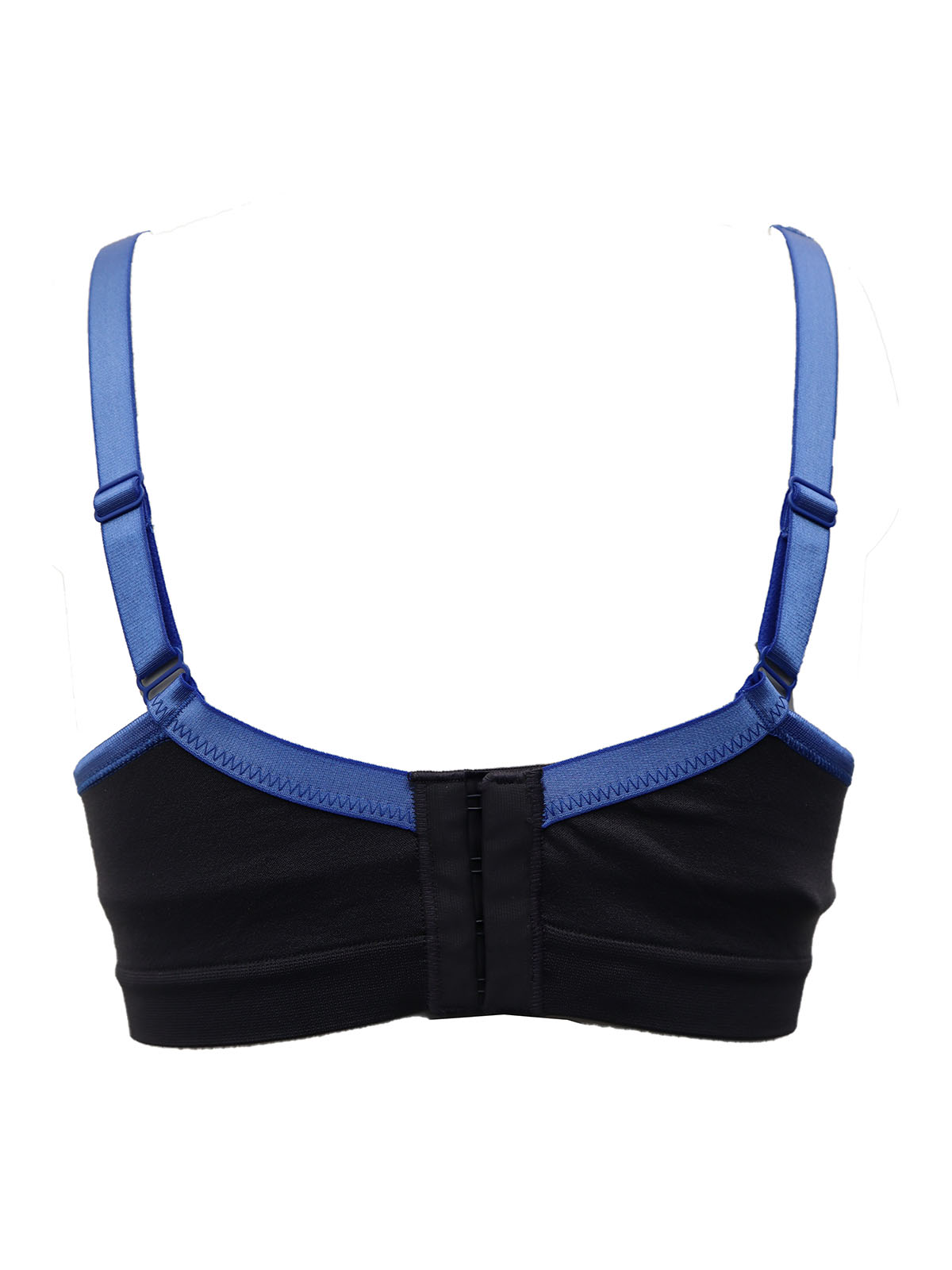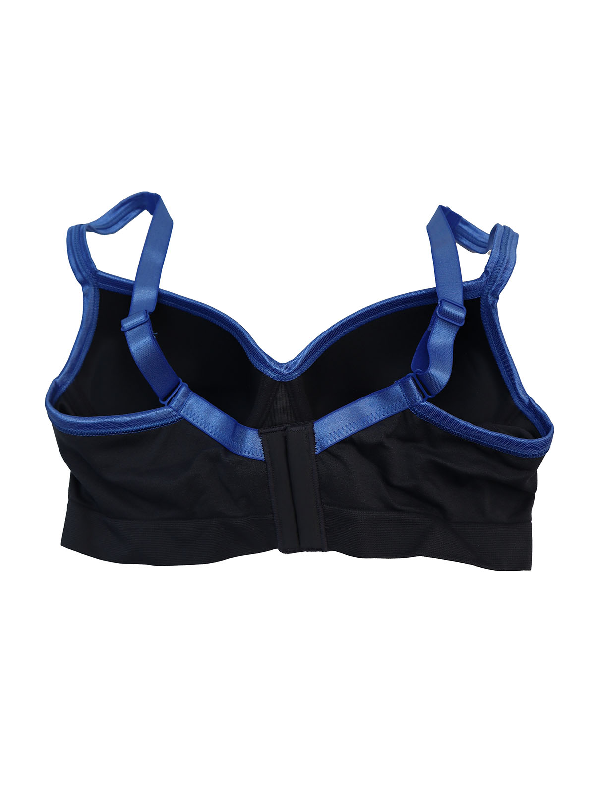 Black push-up bra for light-duty sports with blue contrast border. Integrated push-up pads. Underwired cups for a good fit. Adjustable straps & back closure.