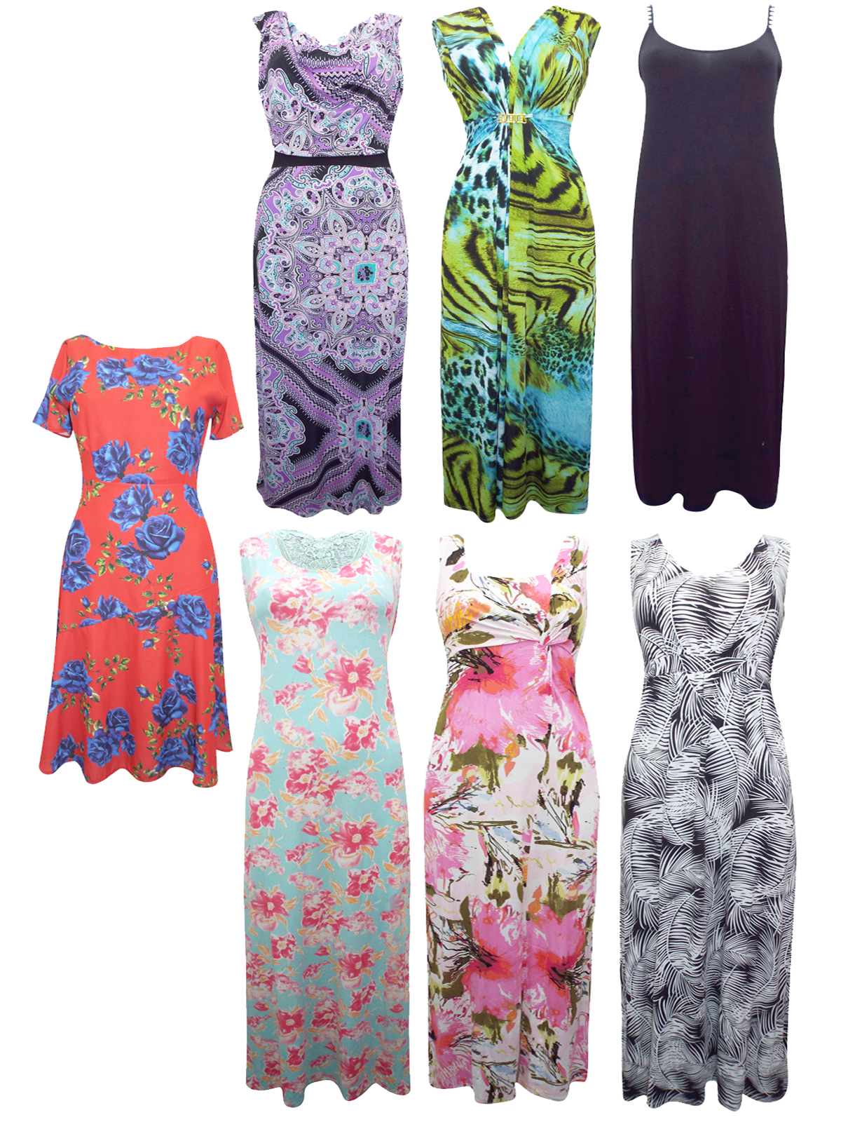 A mixed pack of ladies dresses with a variety of styles and colors and lengths.