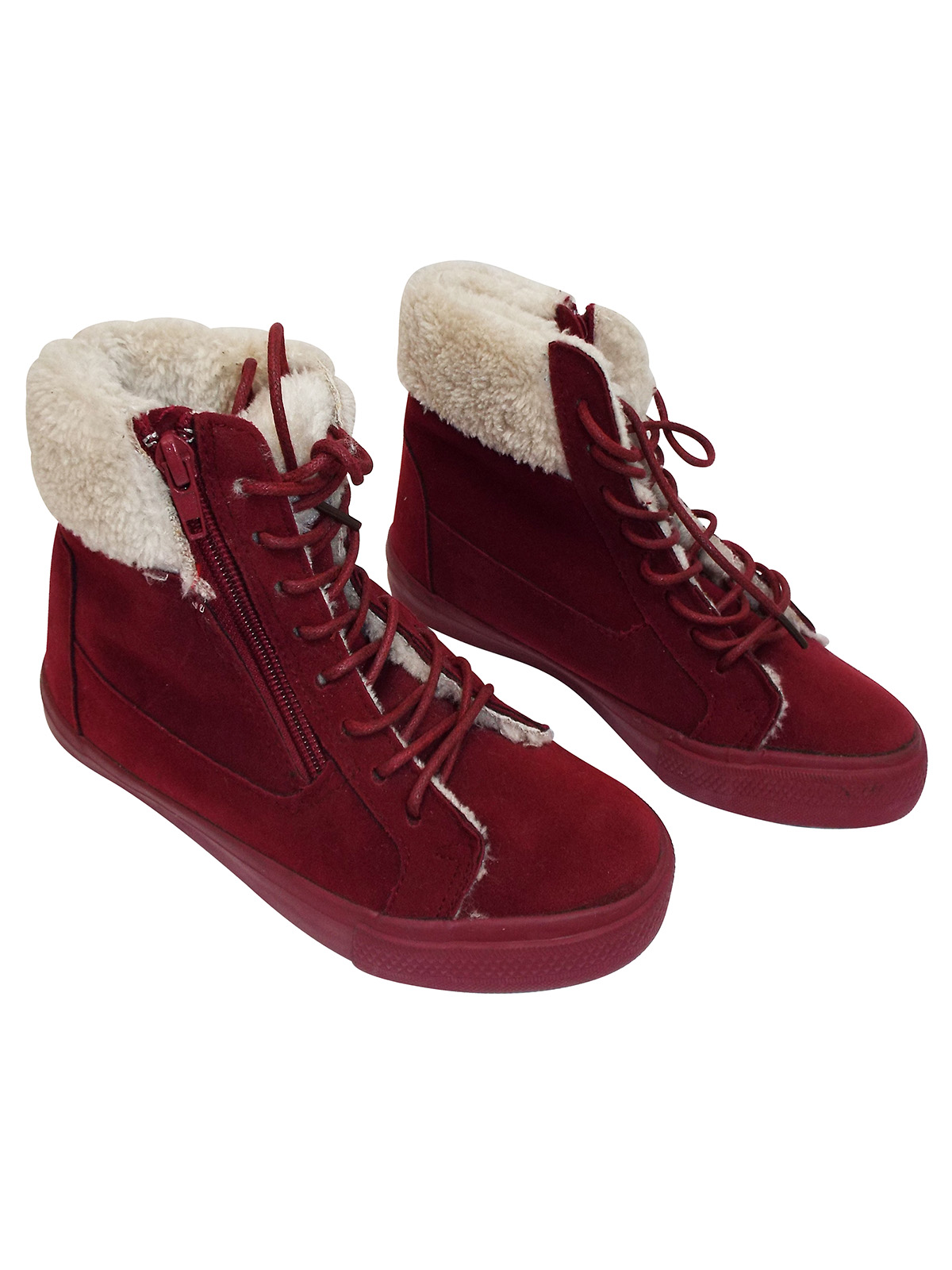 Red suede ankle boots with fleece trim, functional laces and zip. |