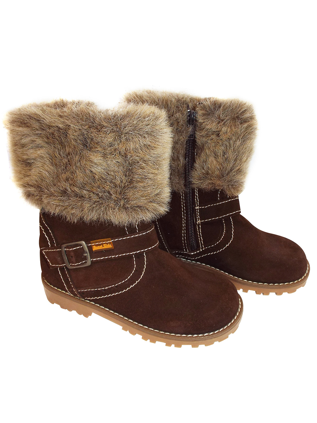 Brown fur trim boots with contrast stitch, buckle detail and side zip fastening. |