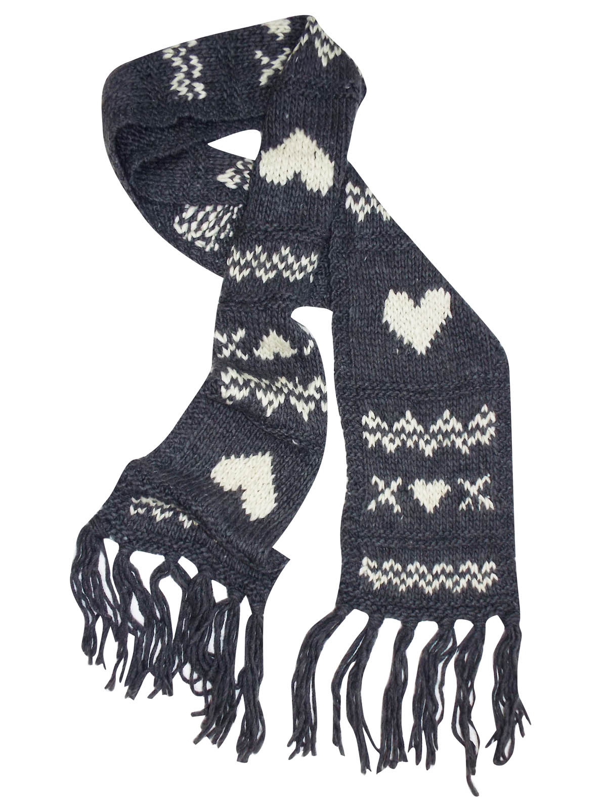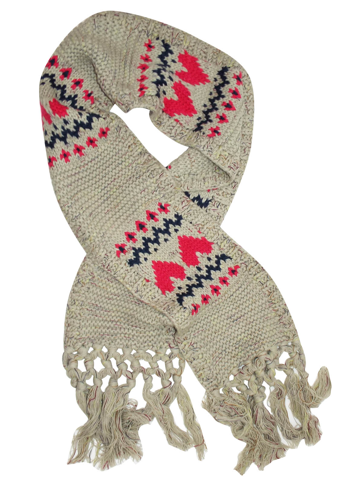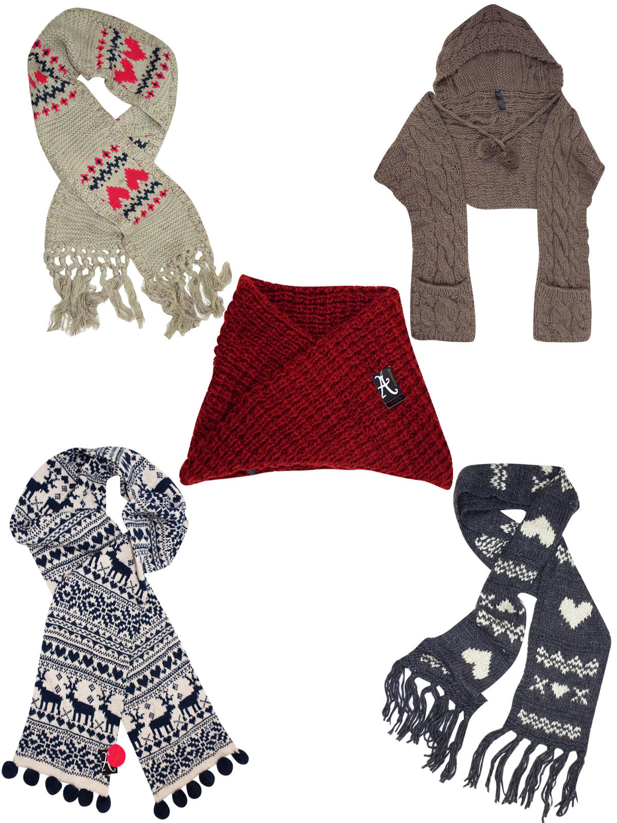 A mixed pack of knitted scarves with a variety of styles and colors and lengths.