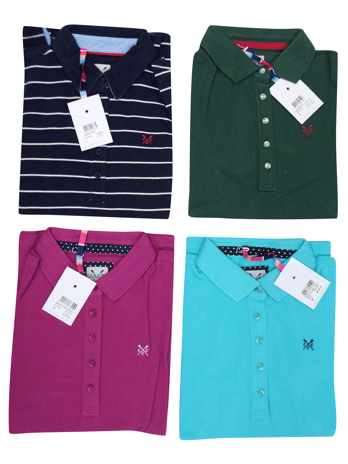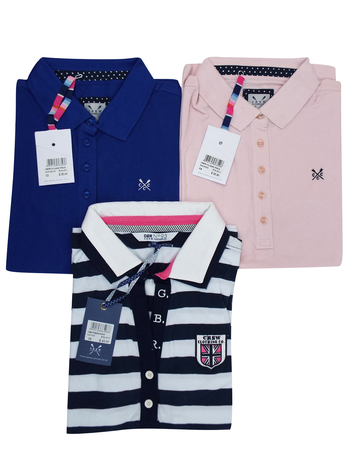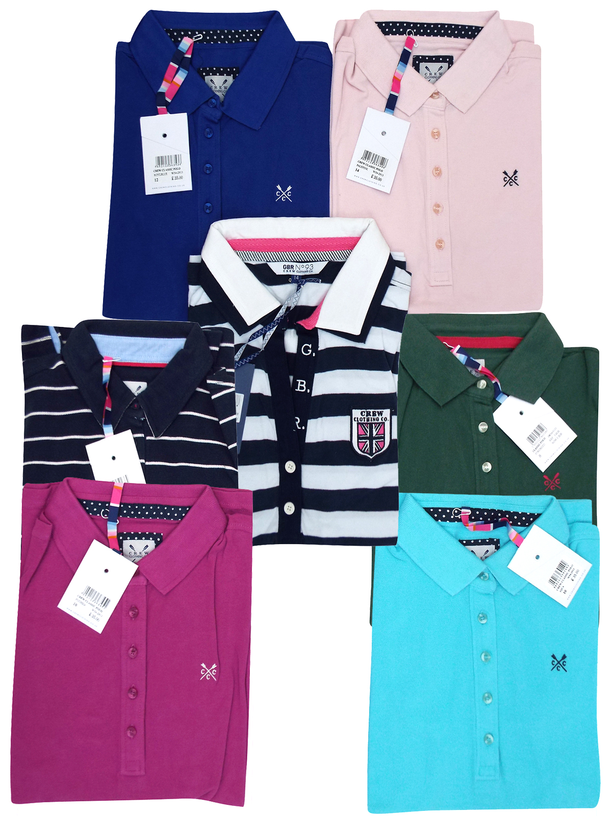A mixed pack of ladies polo shirts with a variety of styles and colors and lengths.