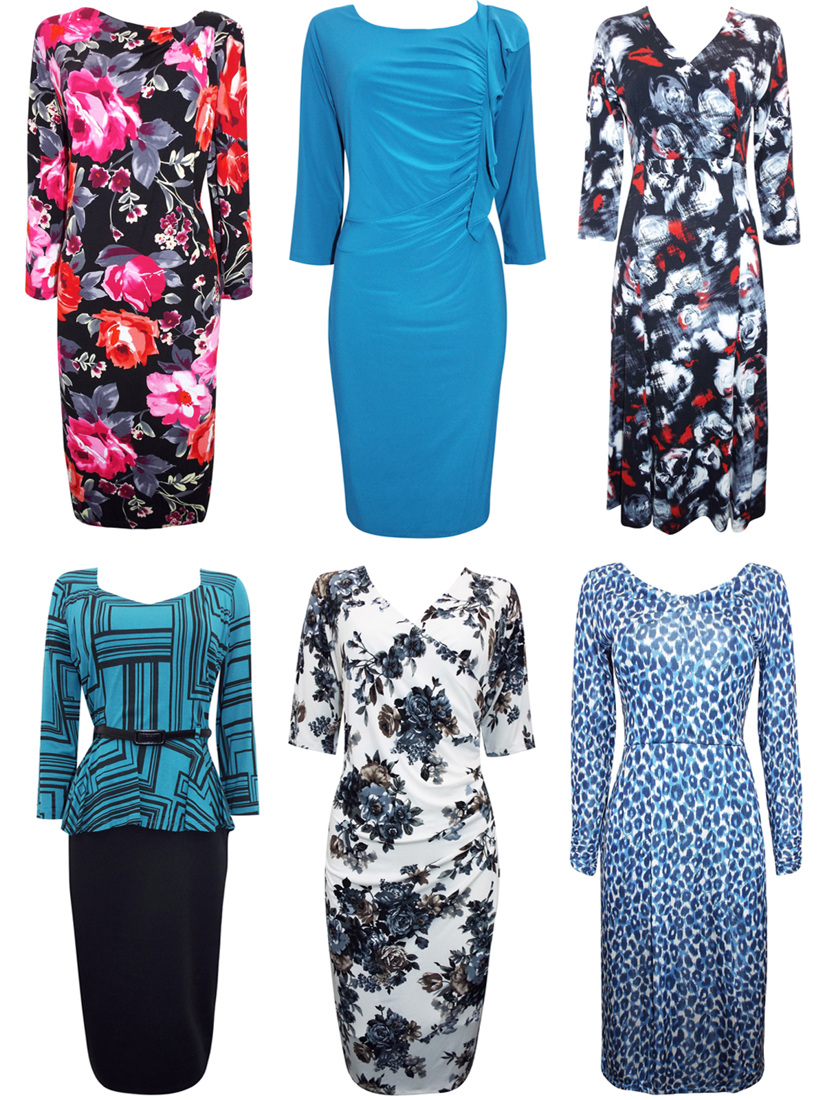 A mixed pack of ladies shift dresses with a variety of styles and colors and lengths.