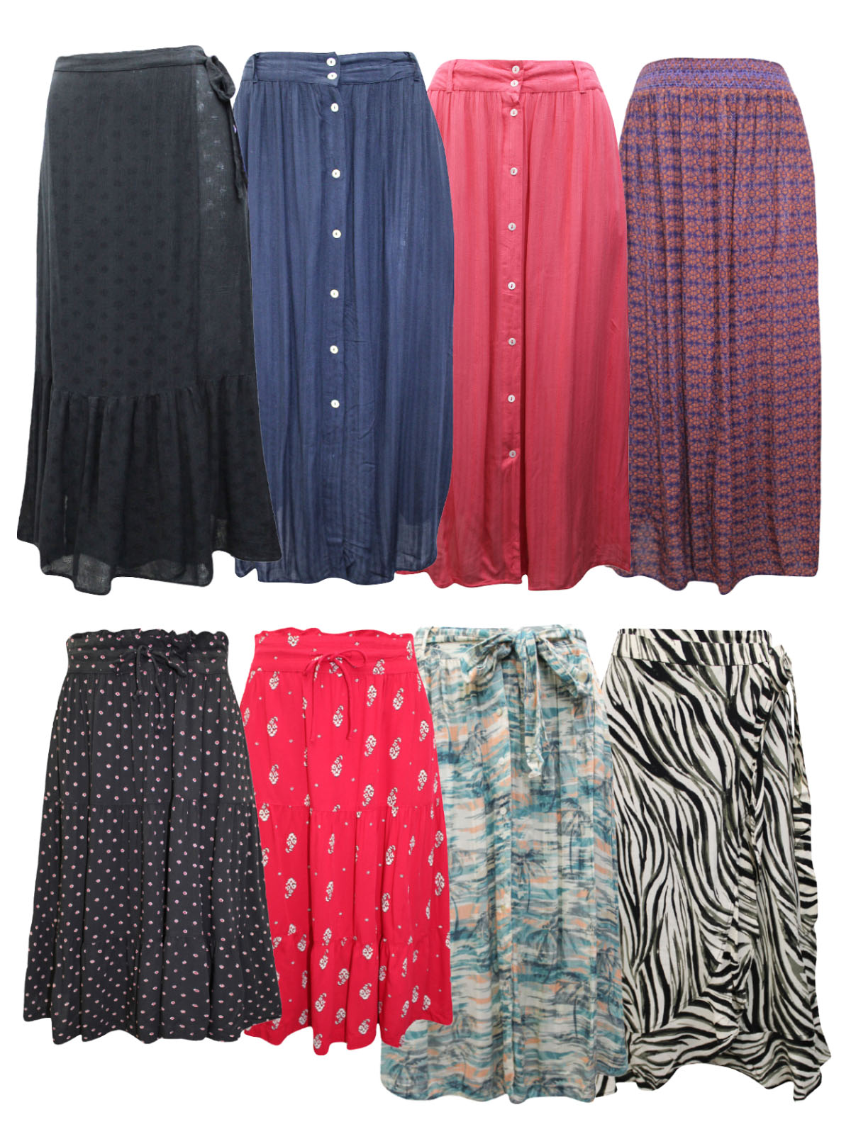 A mixed pack of skirts with a variety of styles, colors and lengths.