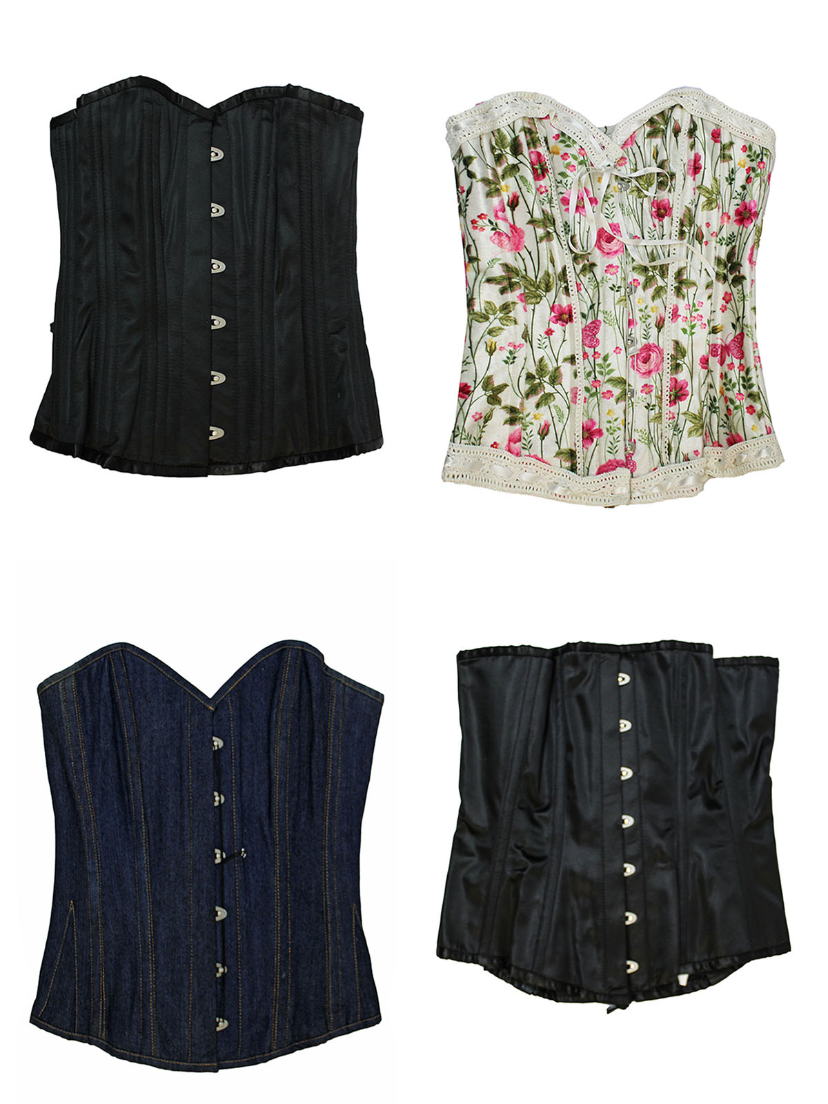 A mixed pack of corsets with a variety of styles, colors and lengths.