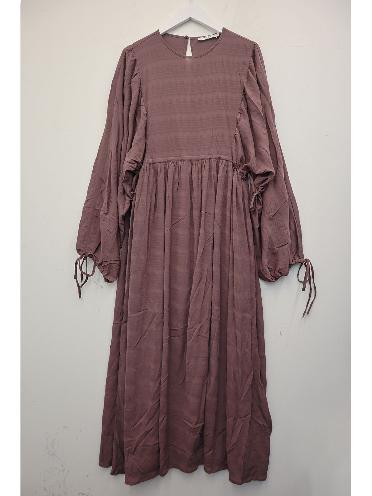 1 Muted purple/mauve long-sleeve striped midi dress with a gathered skirt.