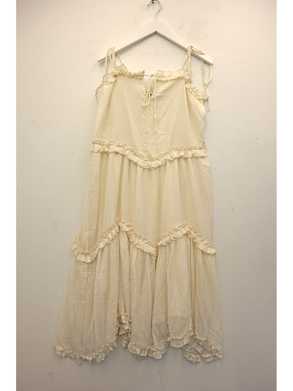 1 Off-white/cream sleeveless tiered midi dress with frills and spaghetti straps.