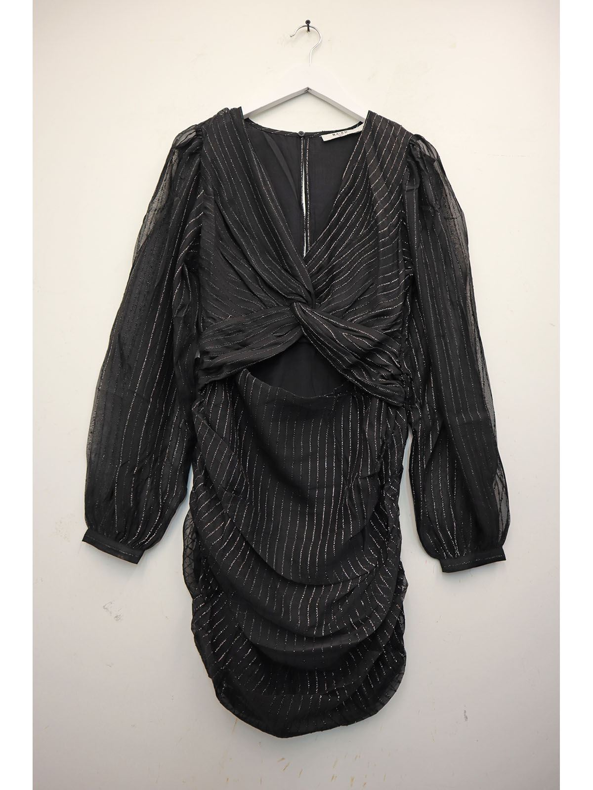 1 Black ruched long-sleeve mini/midi dress with a twist-front detail.