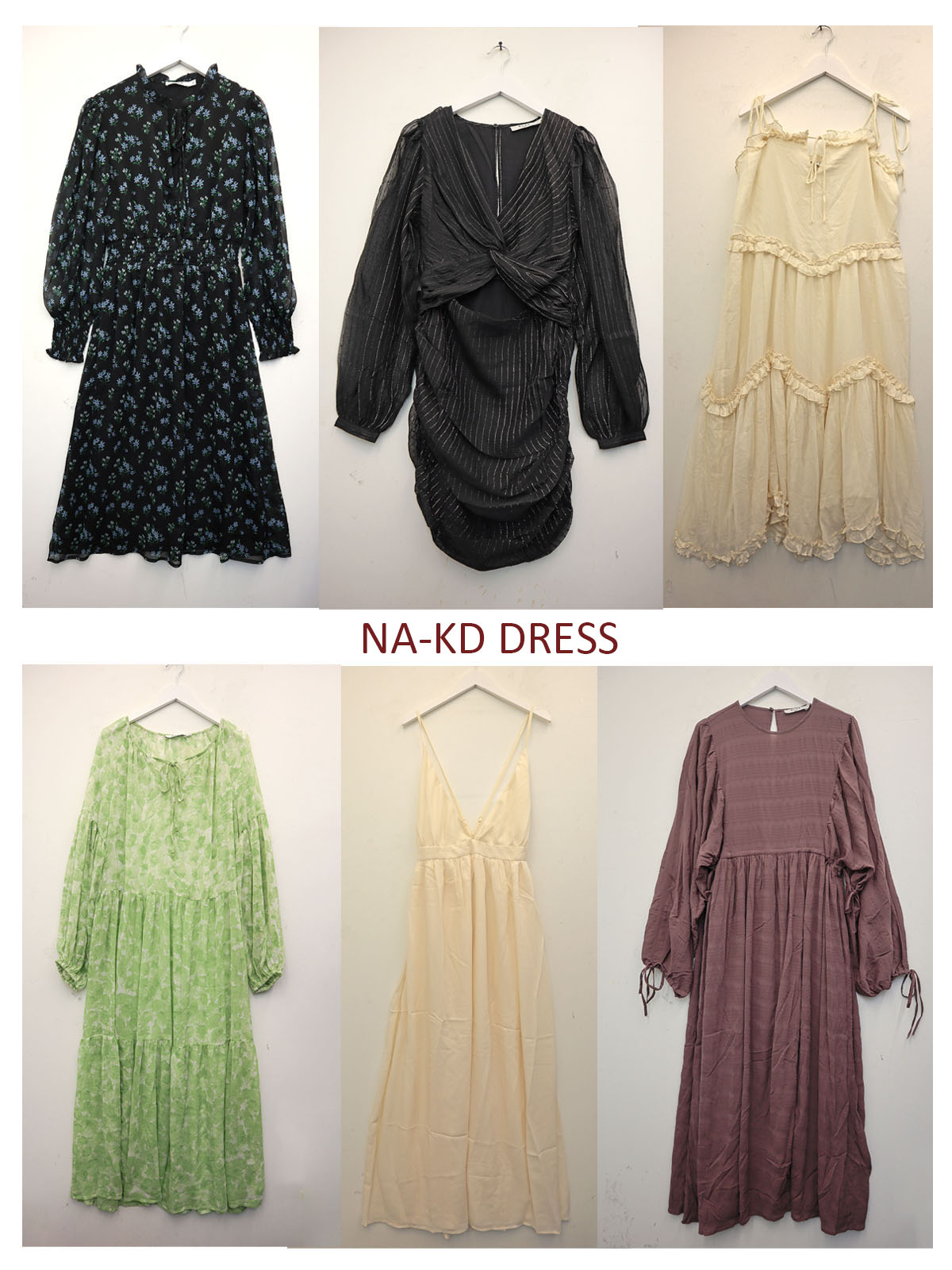 A collection of NA-KD dresses, ranging from floral midi dresses to tiered maxi styles.