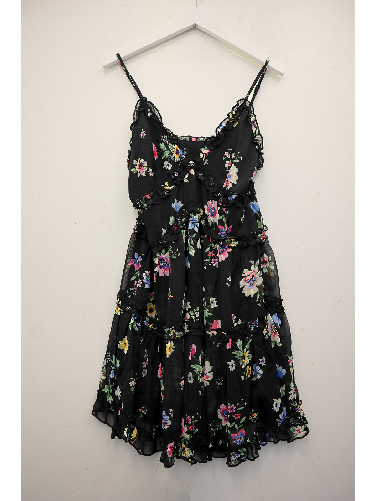 1 Black Floral Mini dress, Spaghetti straps, sweetheart neckline, and ruffled tiers.