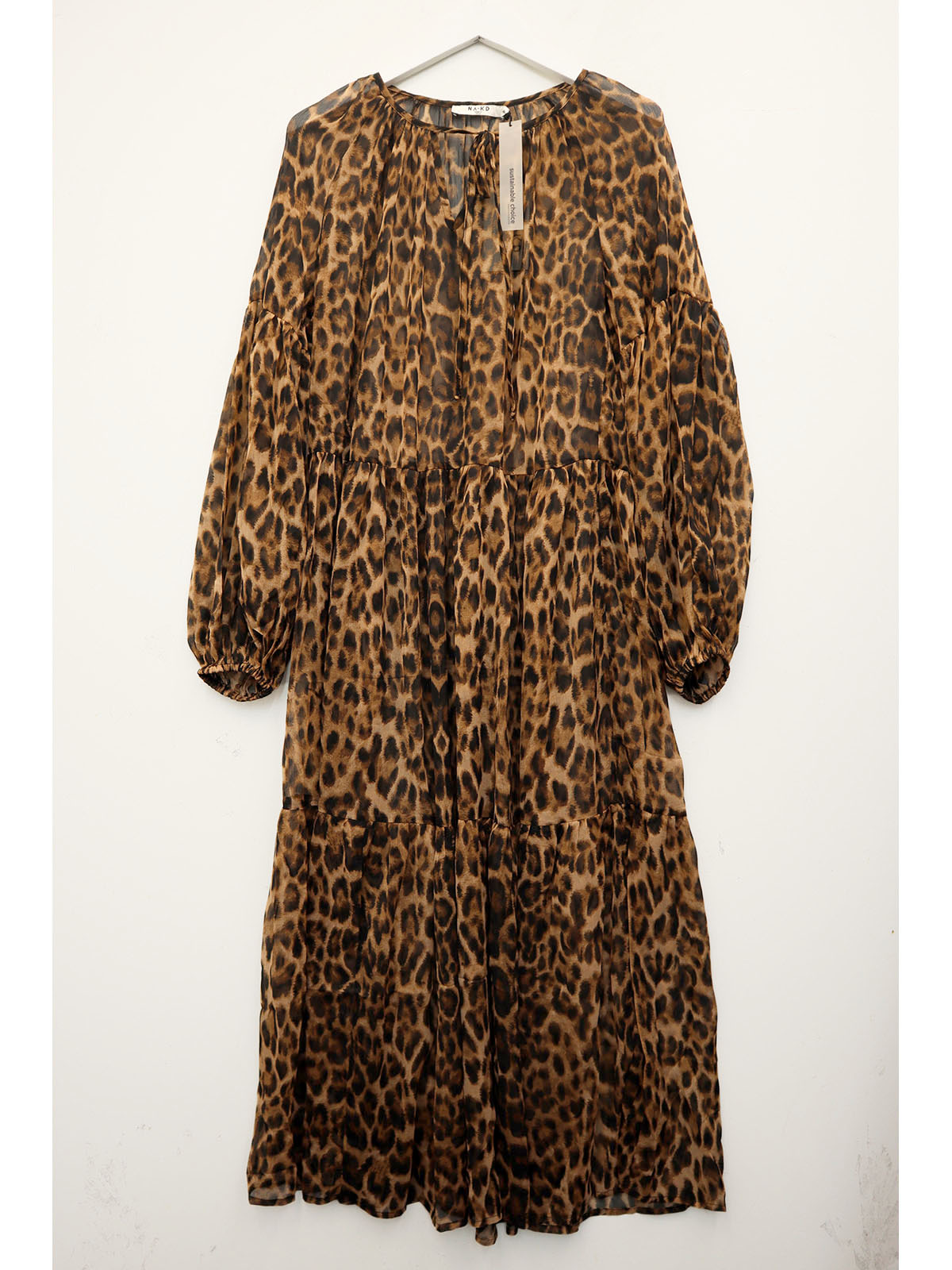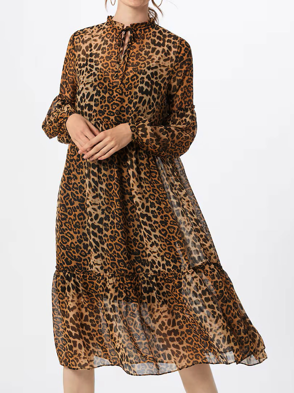 1 Leopard Print Maxi dress, Long sleeves, stand collar, and tiered skirt.