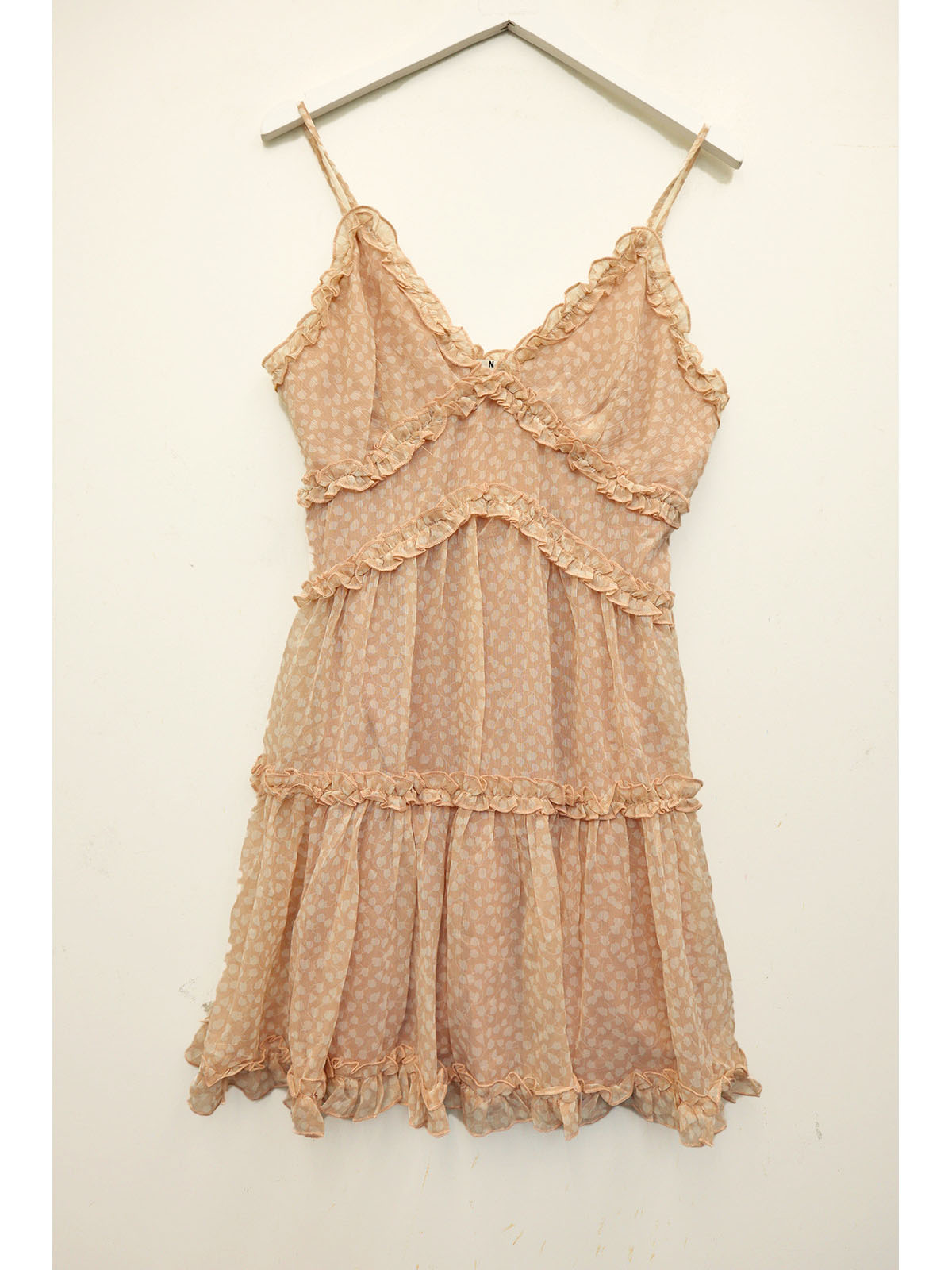 1 Pink Polka Dot Mini dress, Sleeveless with ruffled front straps and tiered skirt.