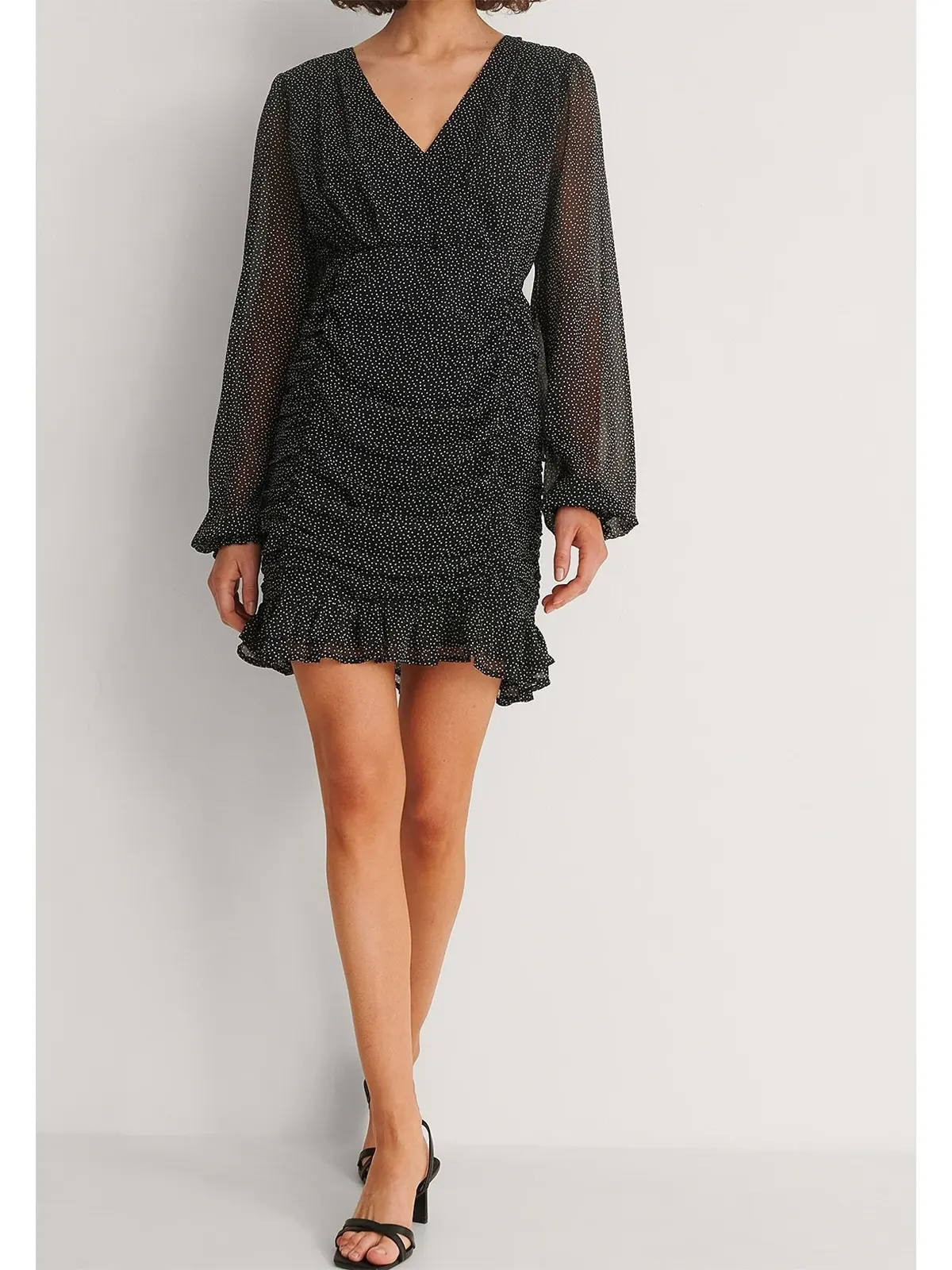 1 Black Ruched Mini dress, Sheer long sleeves, deep V-neck, and ruched detailing.