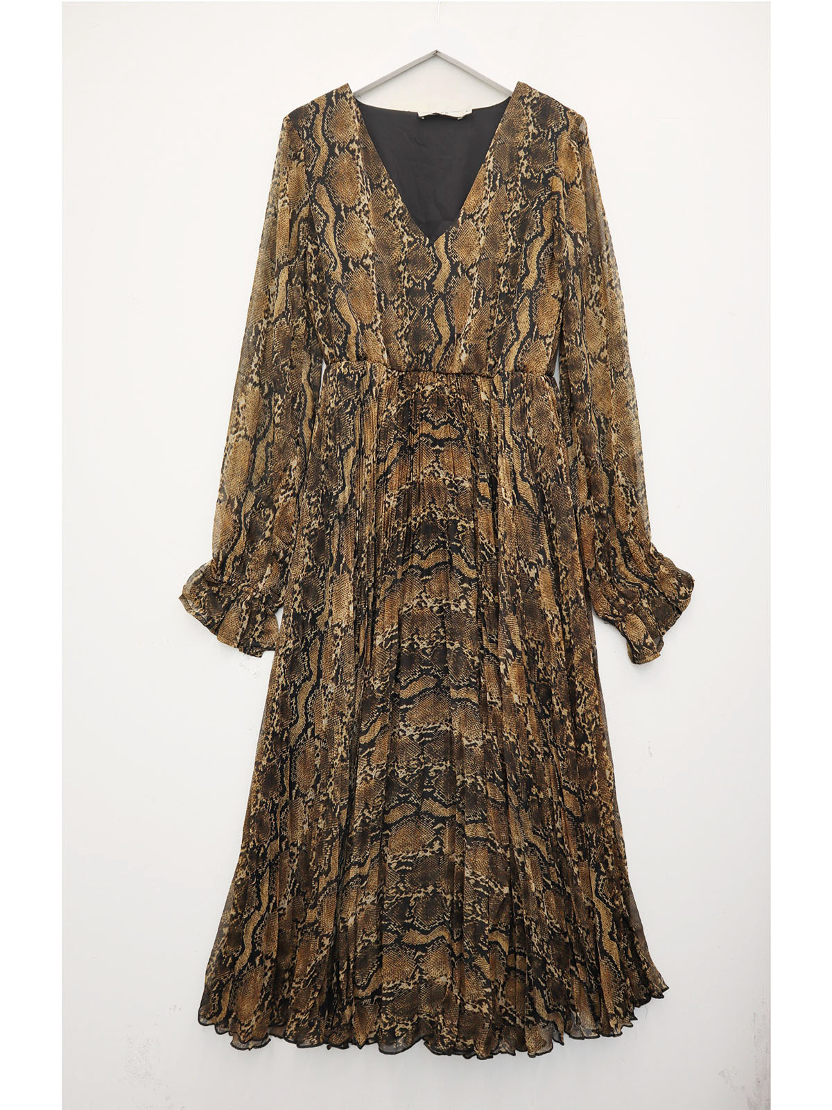 1 Snake Print Midi dress, Long blouson sleeves, pleated skirt, and V-neckline.