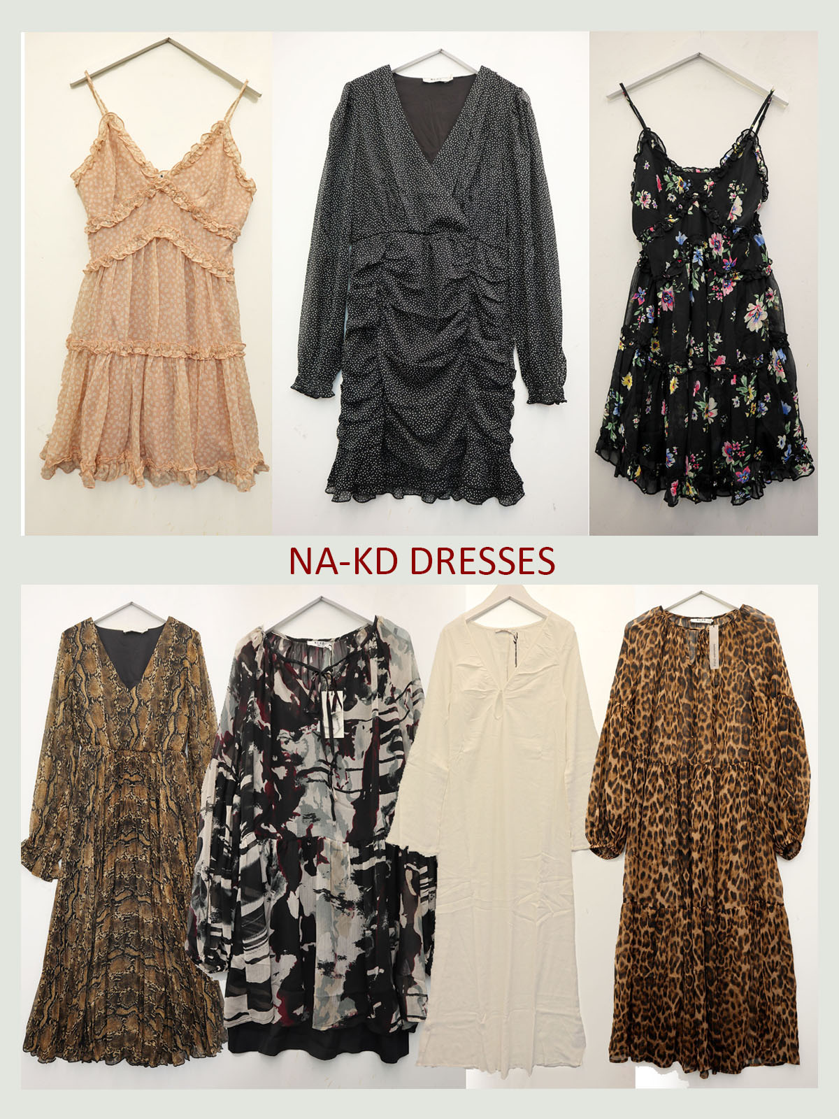 A collection of NA-KD dresses in a variety of styles, prints, and lengths.