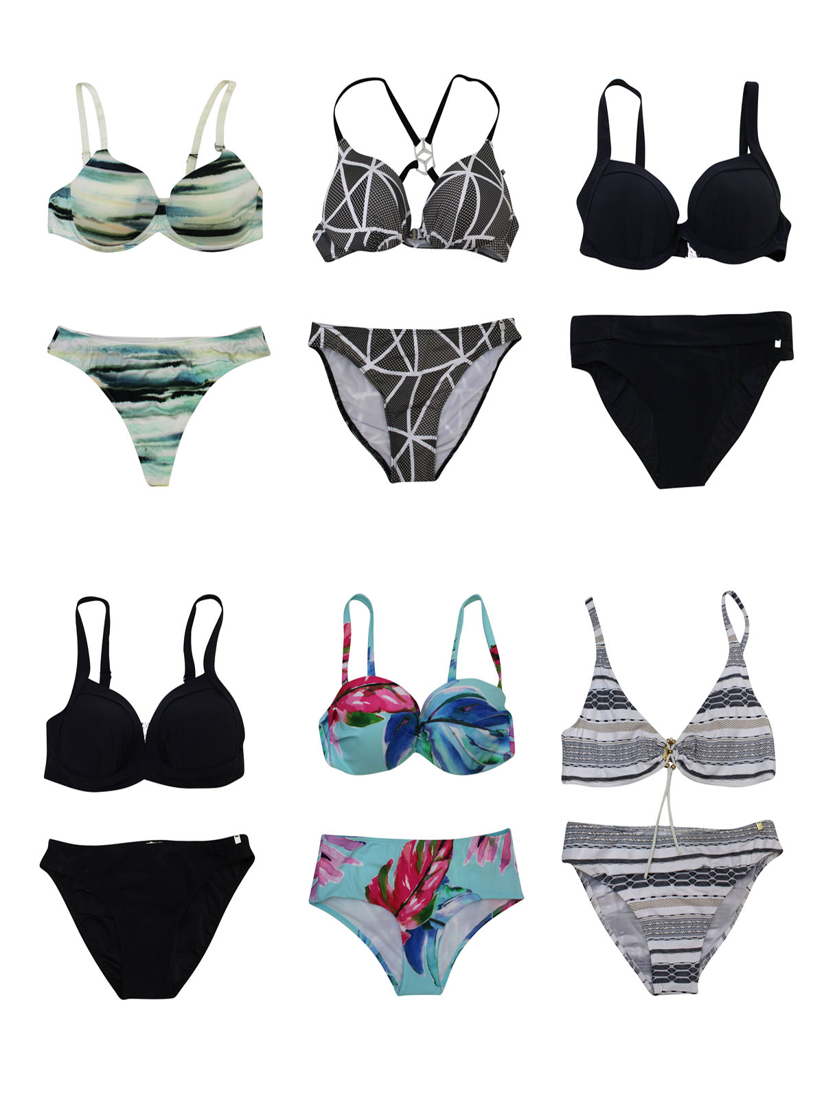 A mixed pack of bikini sets with a variety of styles and colors.