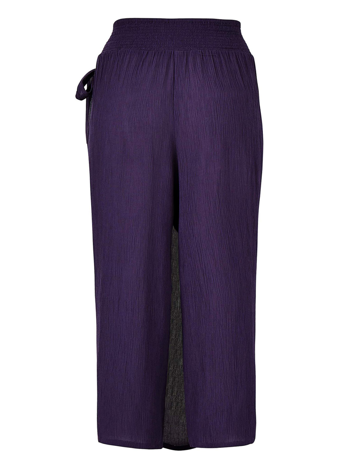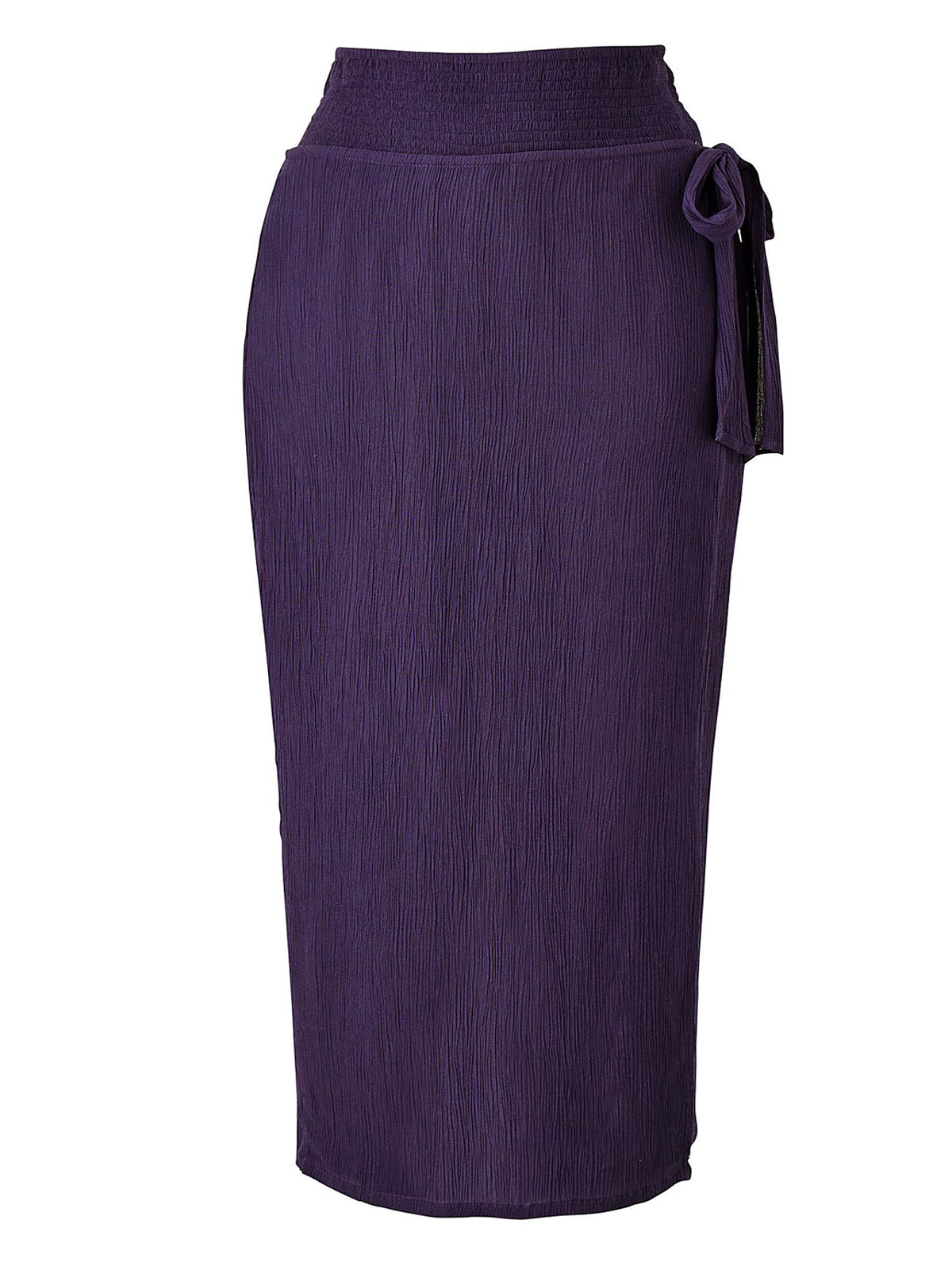 Elasticated deep shirred waist. Wrap-over skirt to front with tie at lower waistband. Soft, easy-care crinkle fabric. Inside leg 19in/48cm.