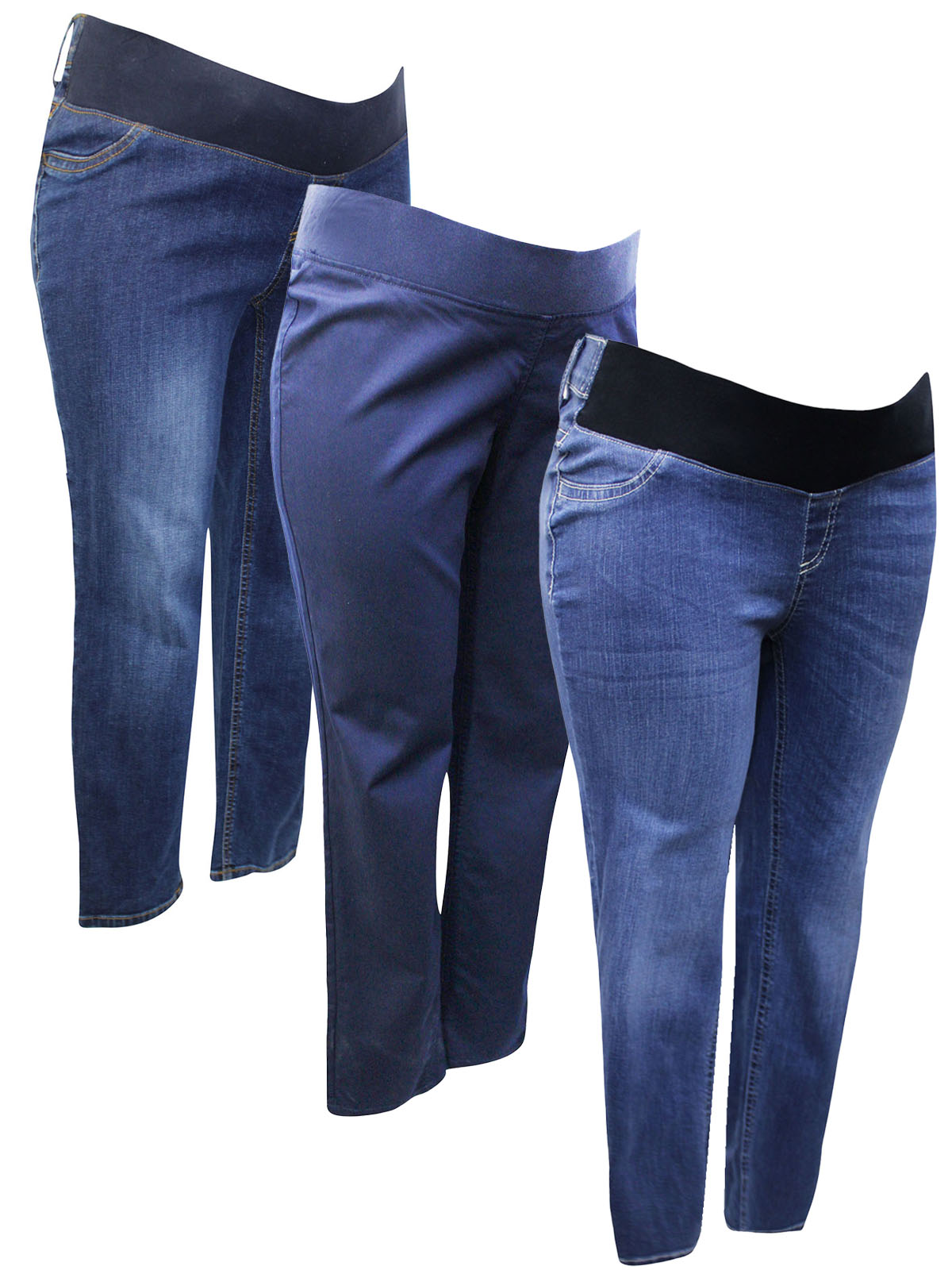 A mixed pack of maternity jeans with a variety of styles, colors and lengths.