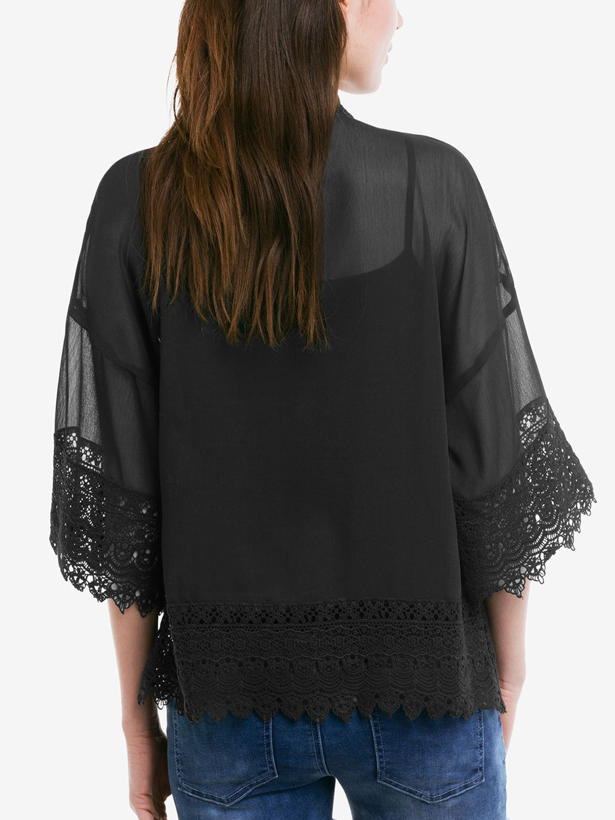 In need of a wardrobe refresh? Look no further than this must-have kimono. Made from a comfortable woven fabric, it features short sleeves, an open front and crochet trims. Length 28in.