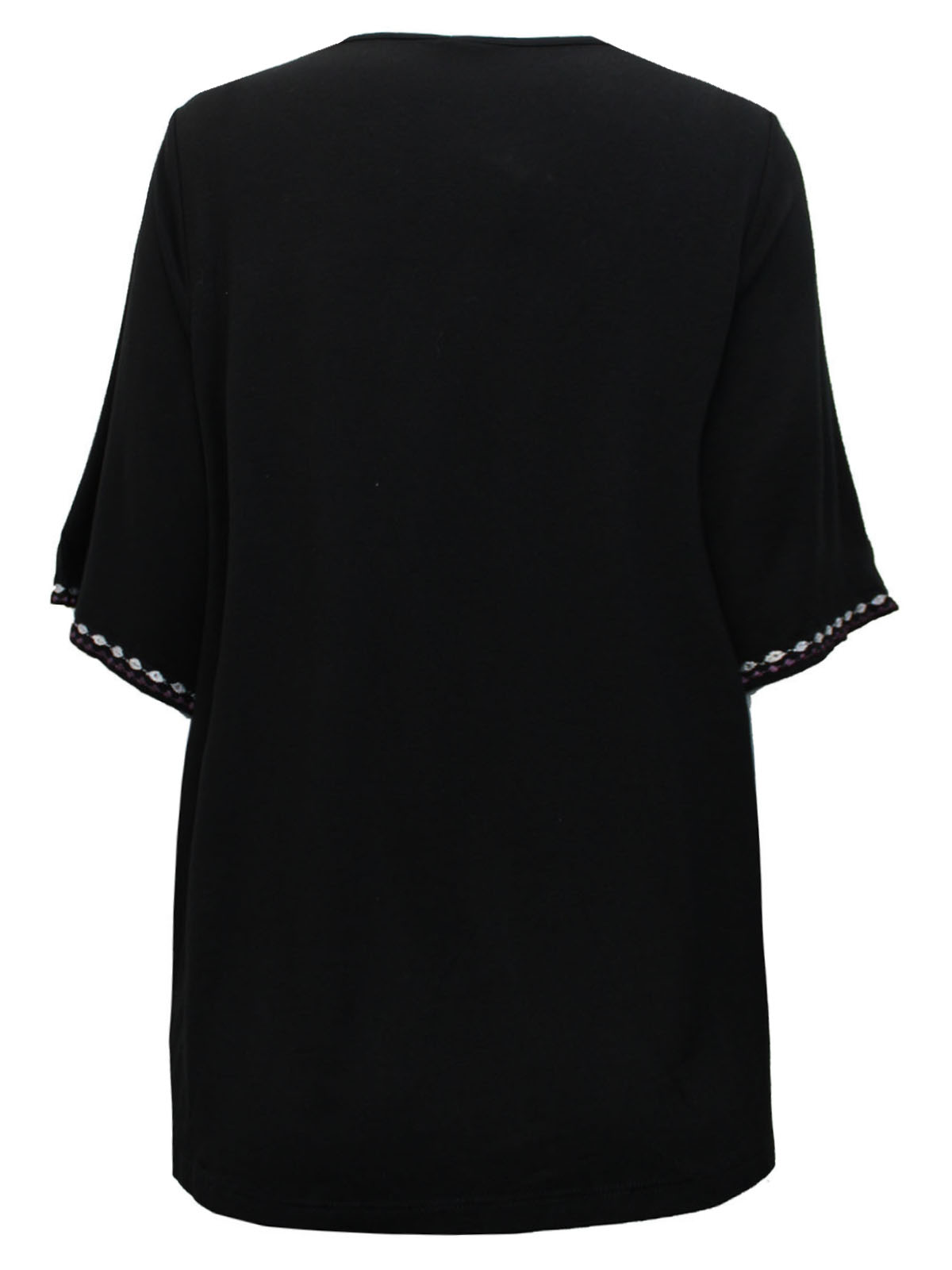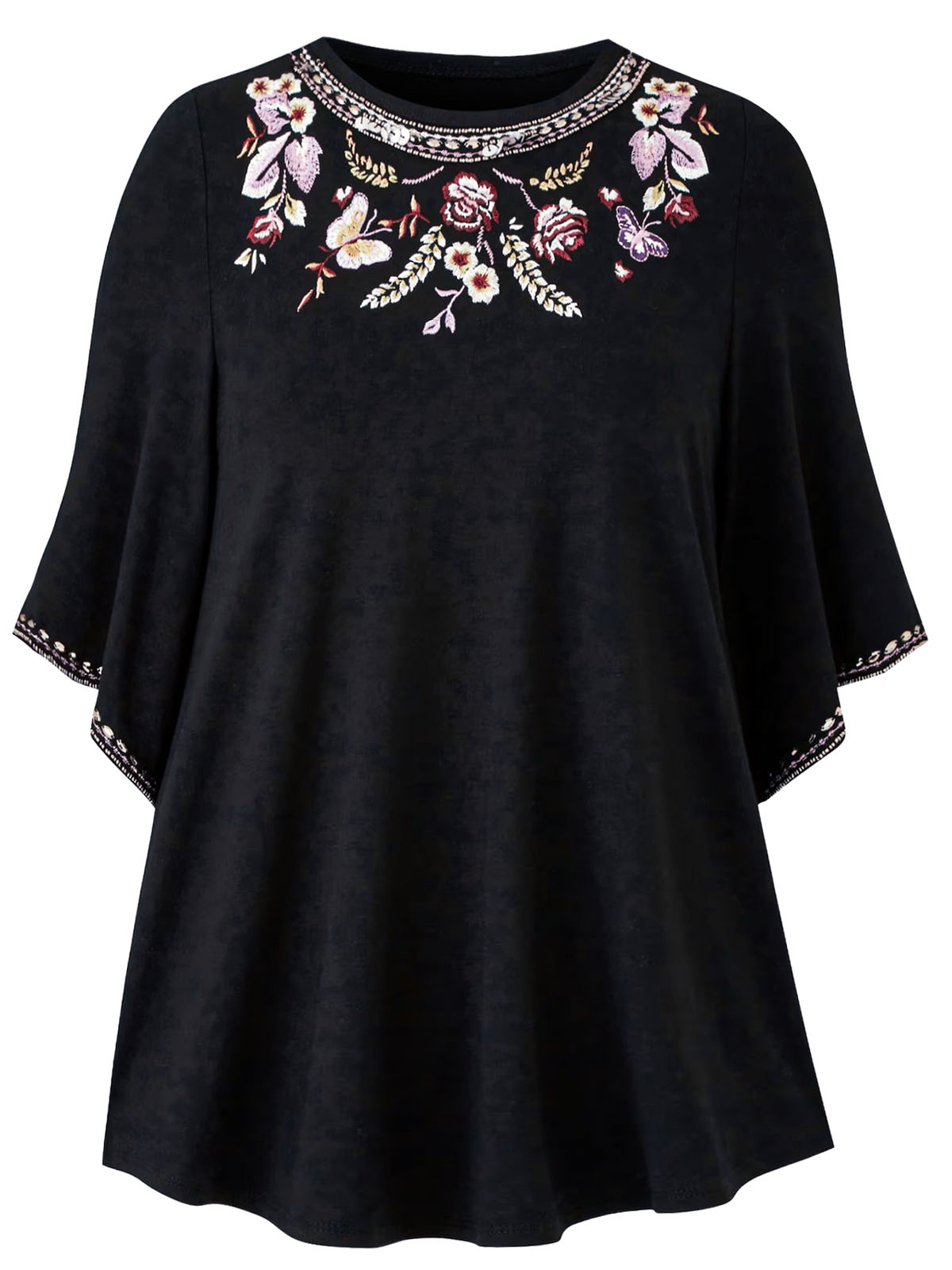 Beautiful detailed and easy fit jersey tee with embroidered and embellished neckline and cape-style sleeves.