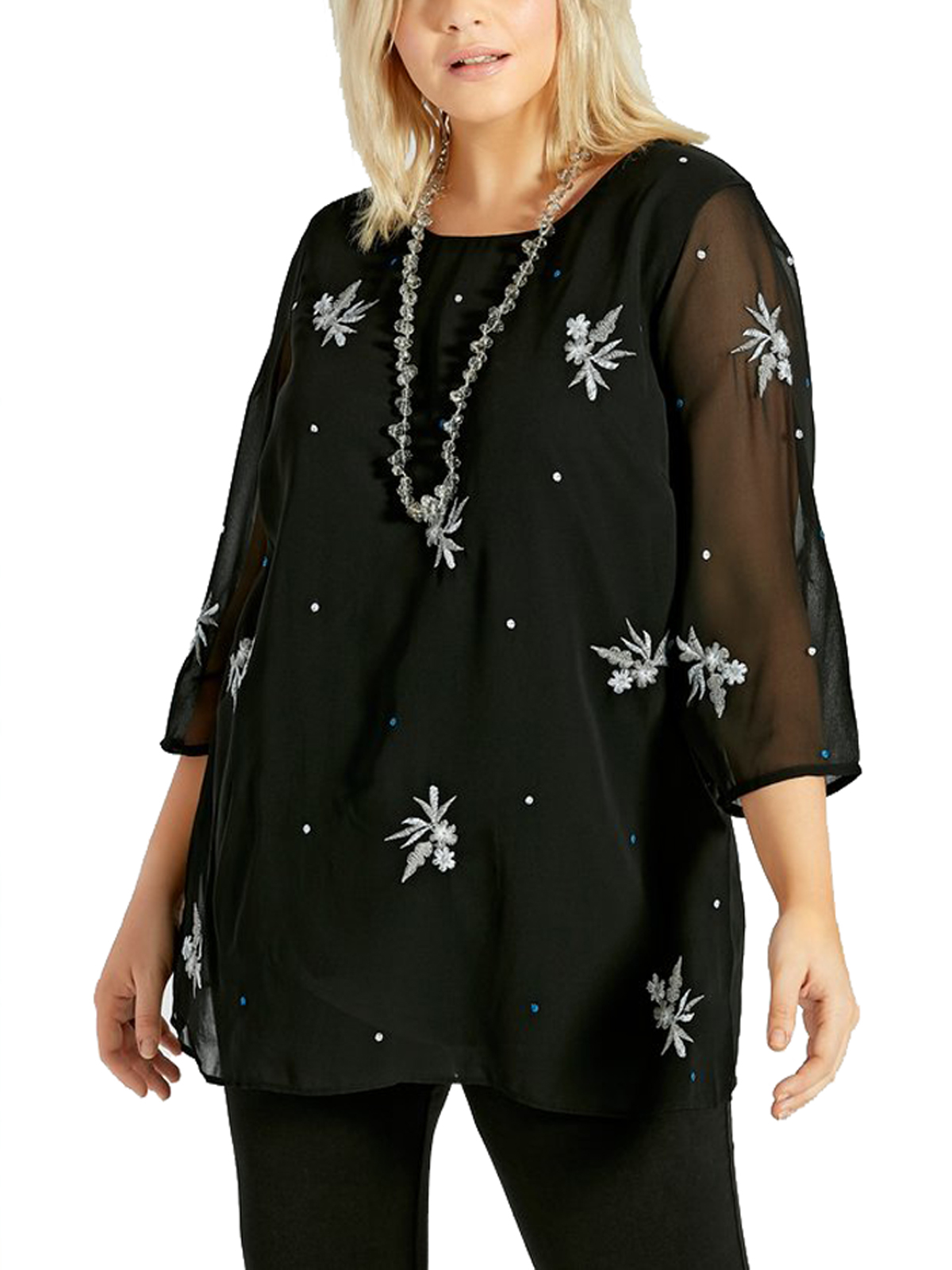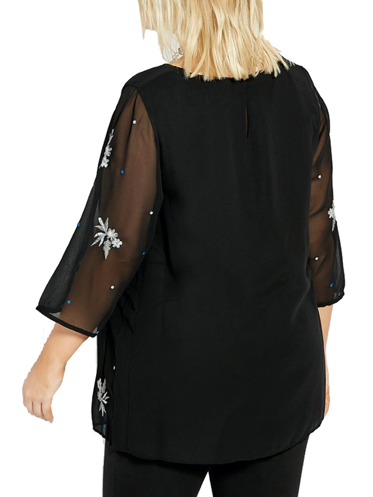 This stunning top is a great buy for your wardrobe. Versatile enough to dress up or down, the front is embroidered. Featuring a scoop neck and sheer 3/4 length sleeves. Length 29in.