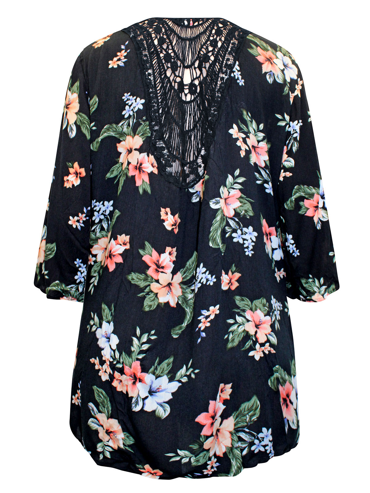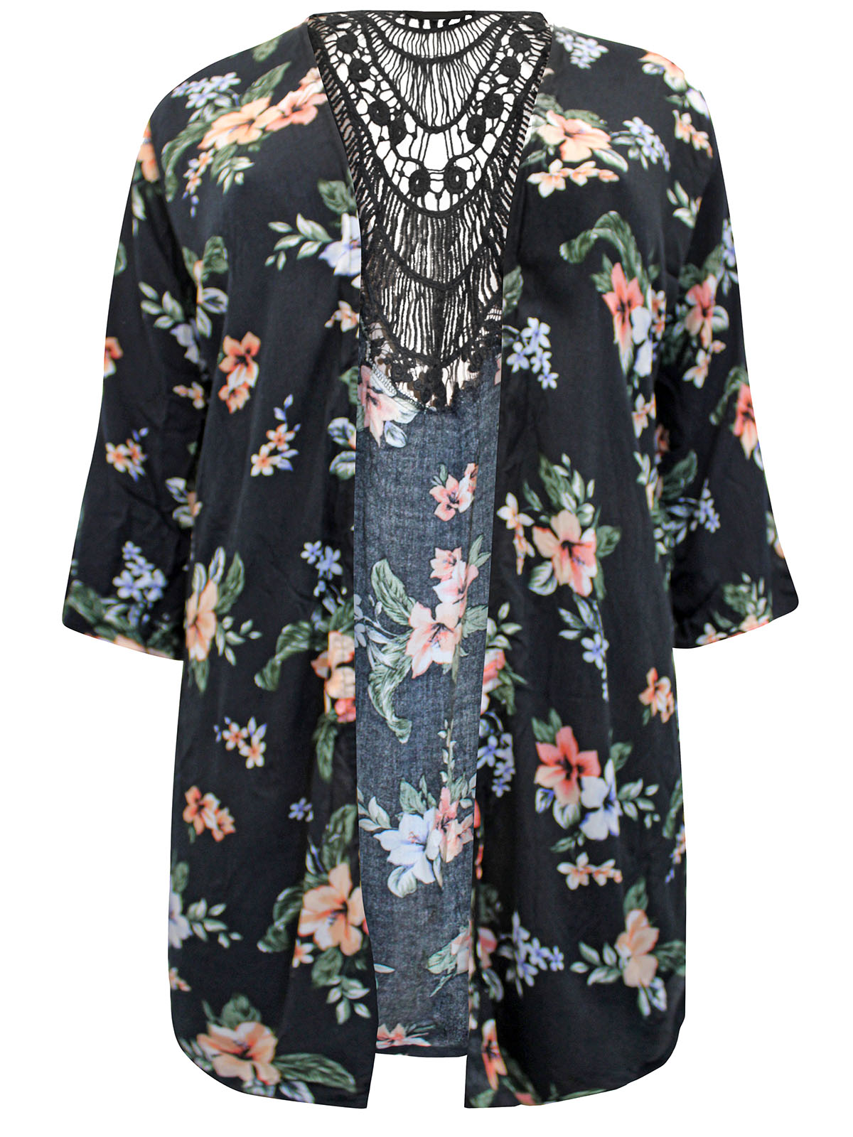 This new-in kimono is set to be your go-to this season. Made from a soft woven fabric, it features a floral print with 3/4 length sleeves and a crochet back. Length 31-35in.
