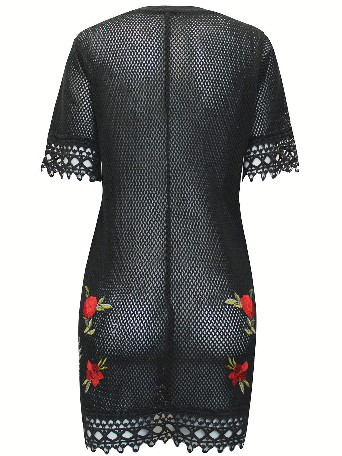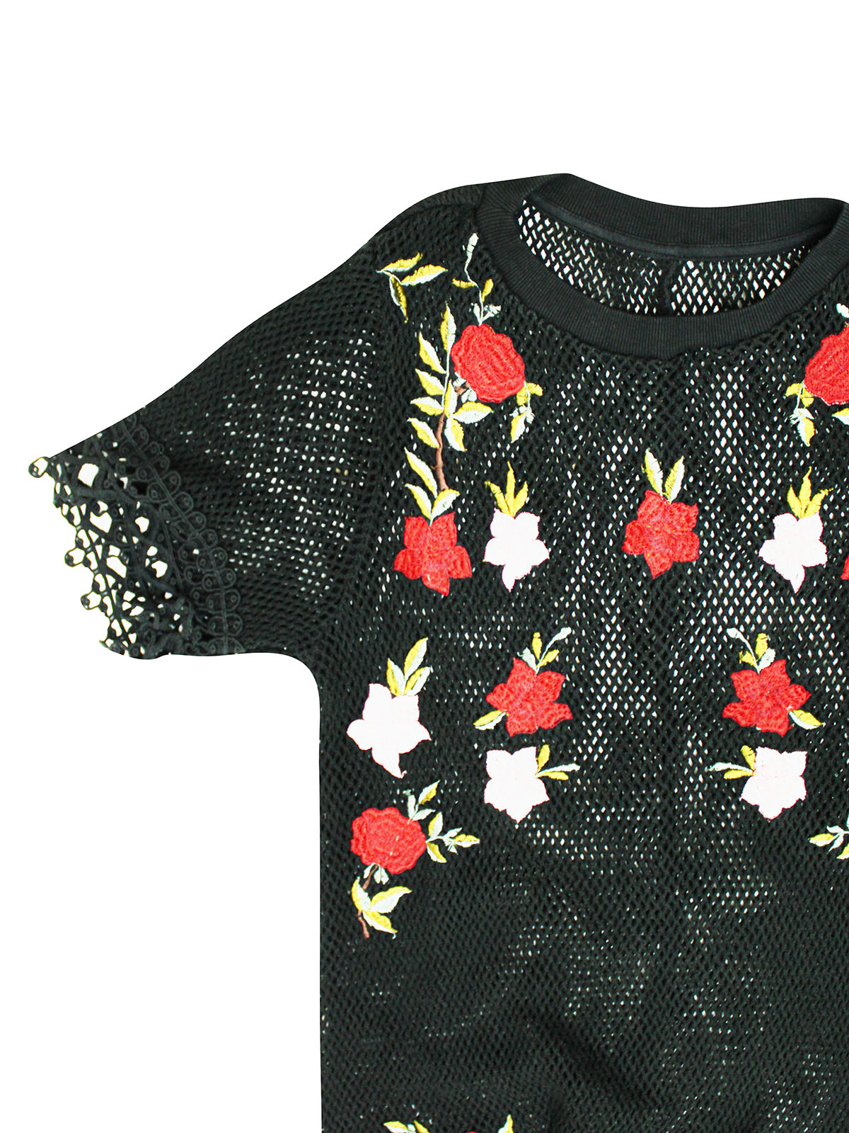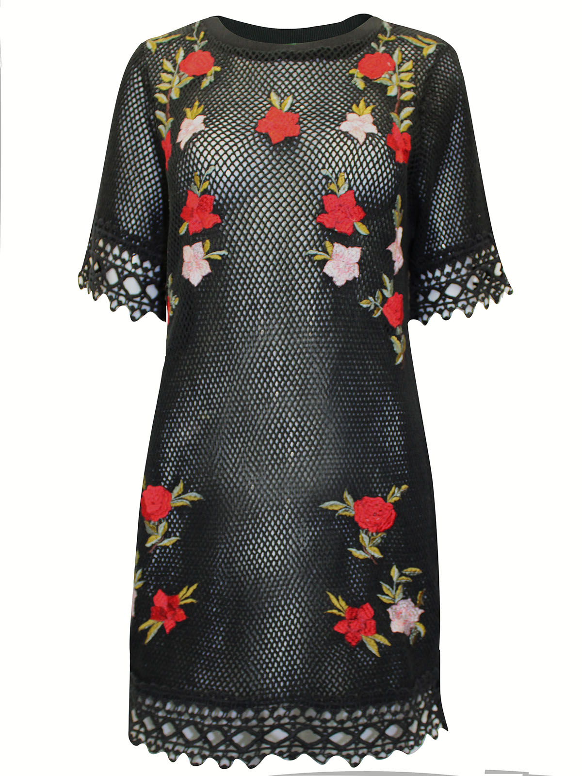 Featuring a round neck with short sleeves and pretty floral embroidery. Length 35in.