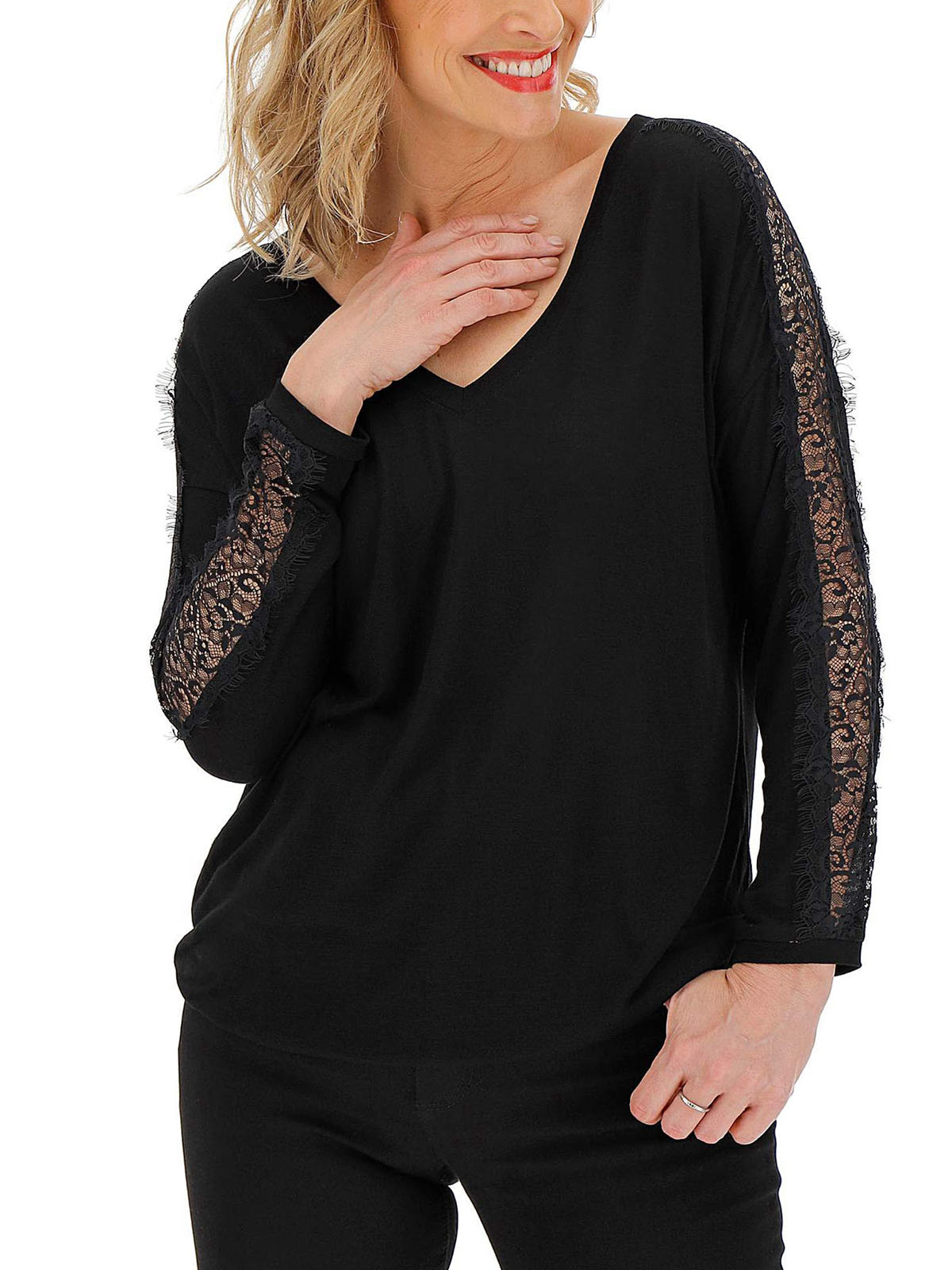 Planning a night of dinner and drinks? This top is perfect! Featuring lace sleeves and a scoop neckline, complete in a comfortable jersey fabric.