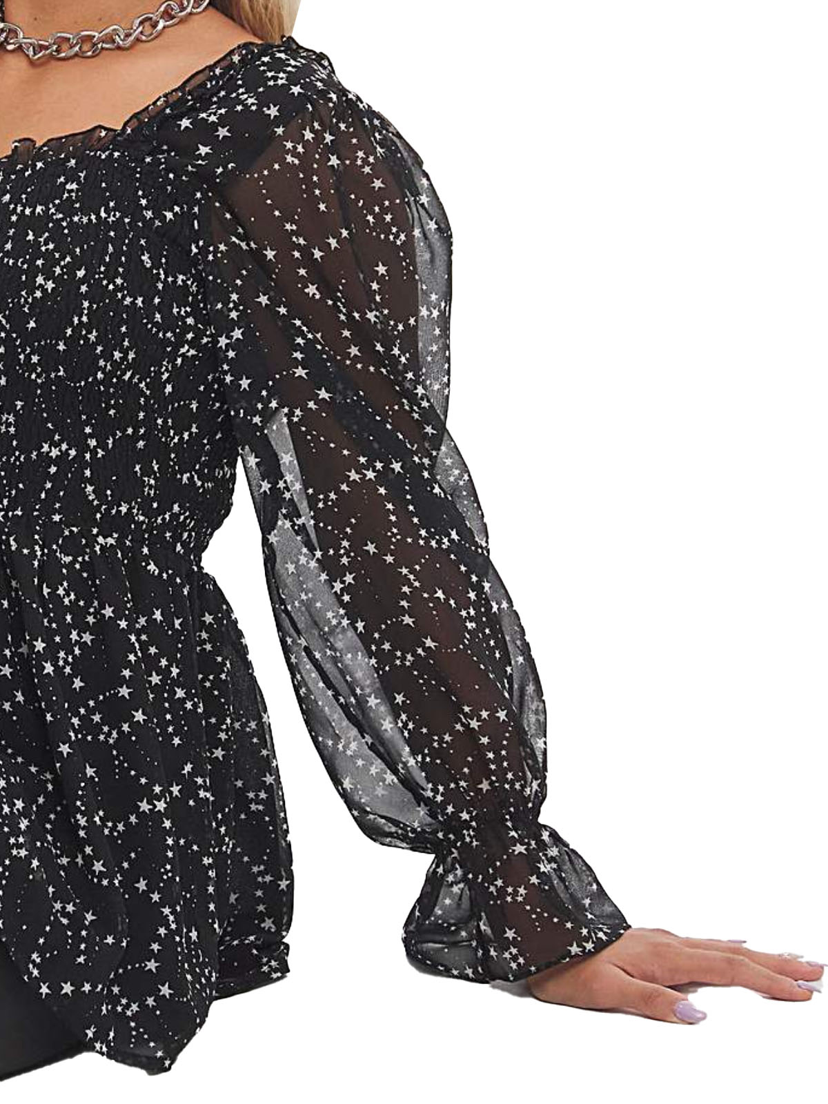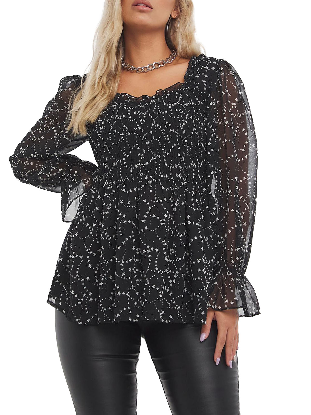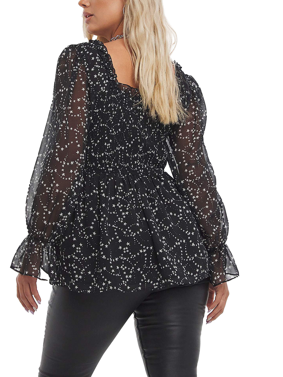 This super on-trend top is a must-have for your wardrobe this season. Featuring a flattering peplum shape in a gorgeous mono print, shirred body and long sleeves. Length 27in.
