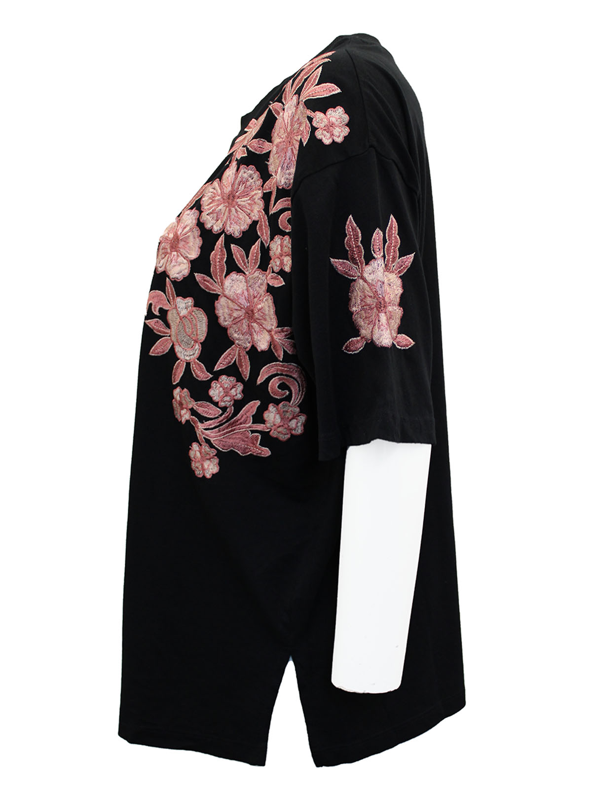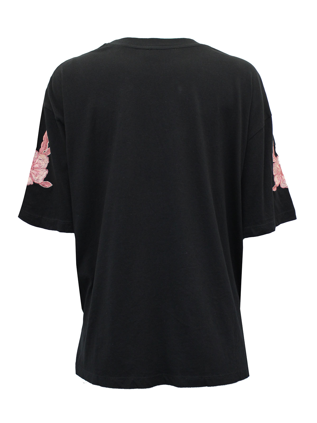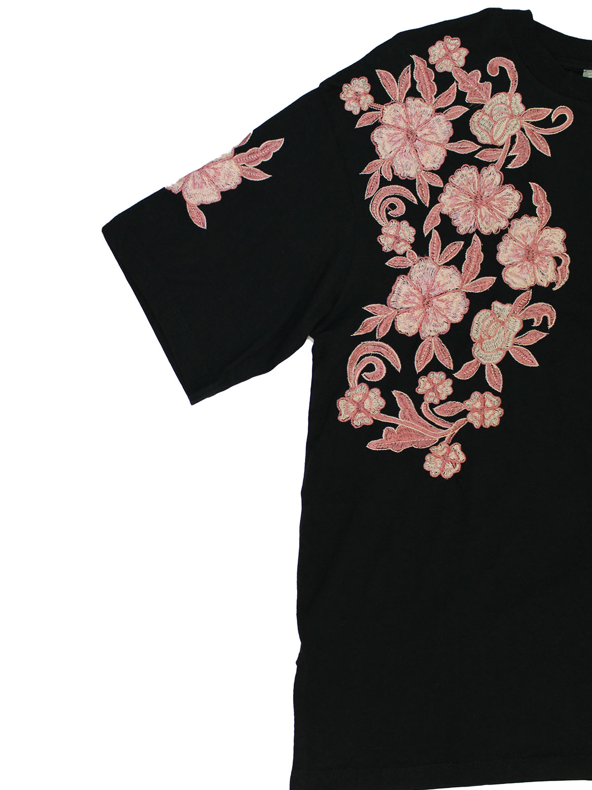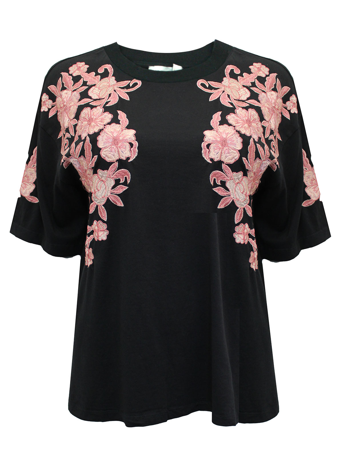 There's always room for another nice top. Crafted from a cotton fabric with a round neck, appliqué front and short sleeves. Length 26in.