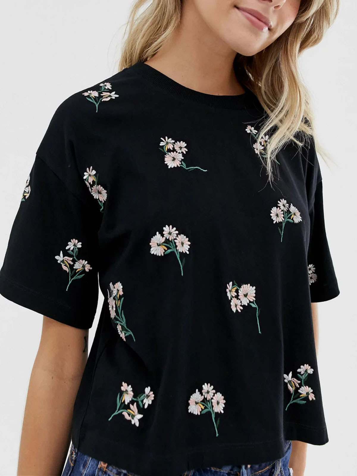 Add pretty floral embroidery to your top collection with this black crop t-shirt. Designed in a boxy fit, it goes with everything. Featuring a round neck, short sleeves and floral embroidery. Length 21in.