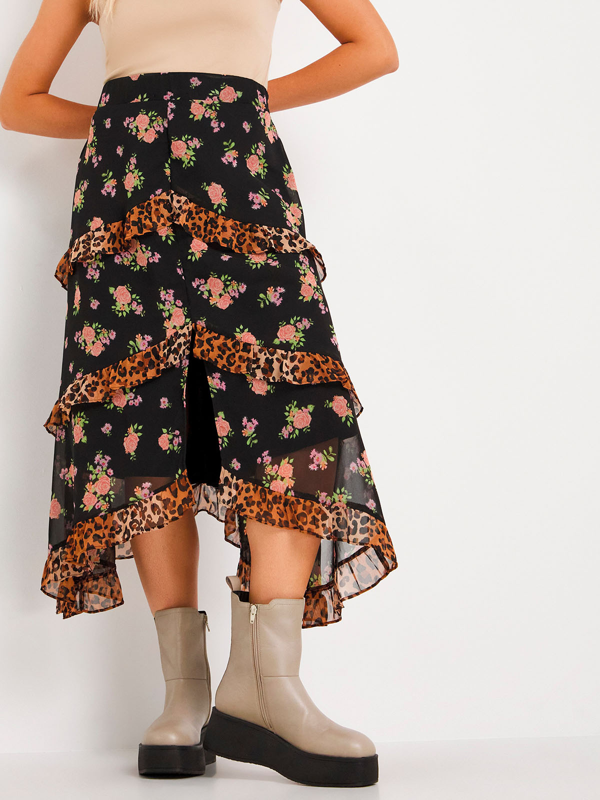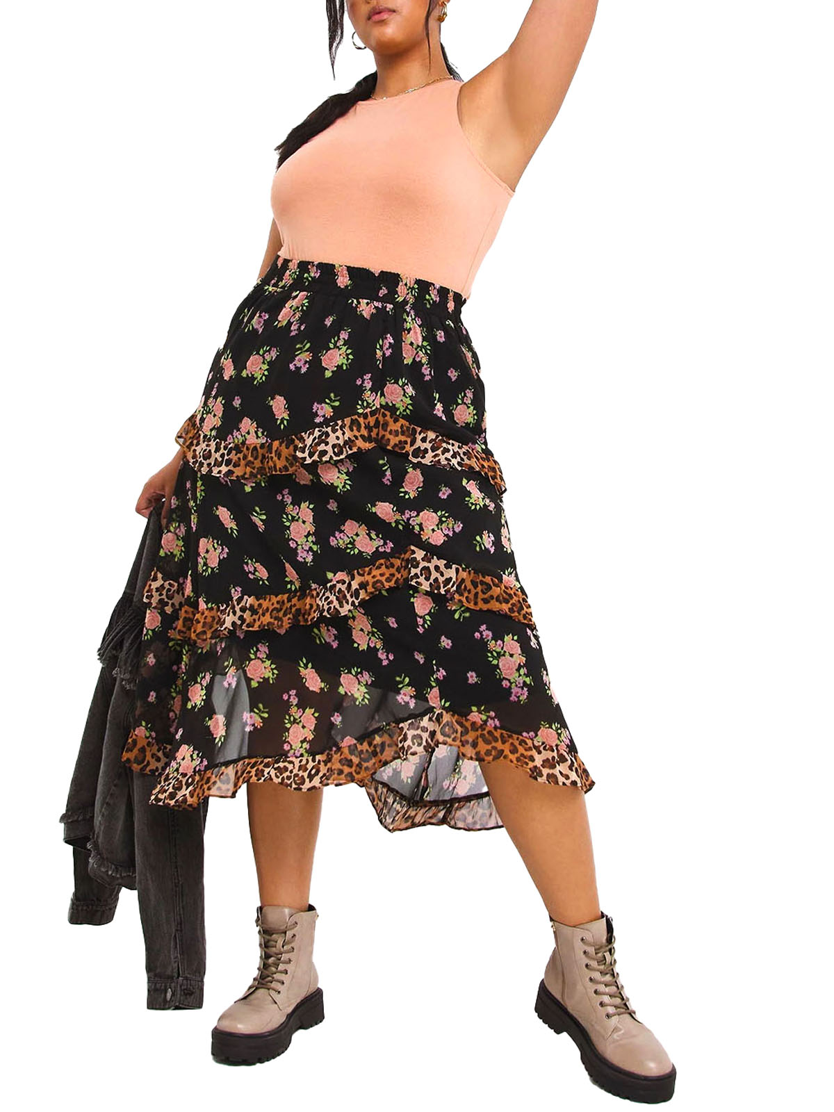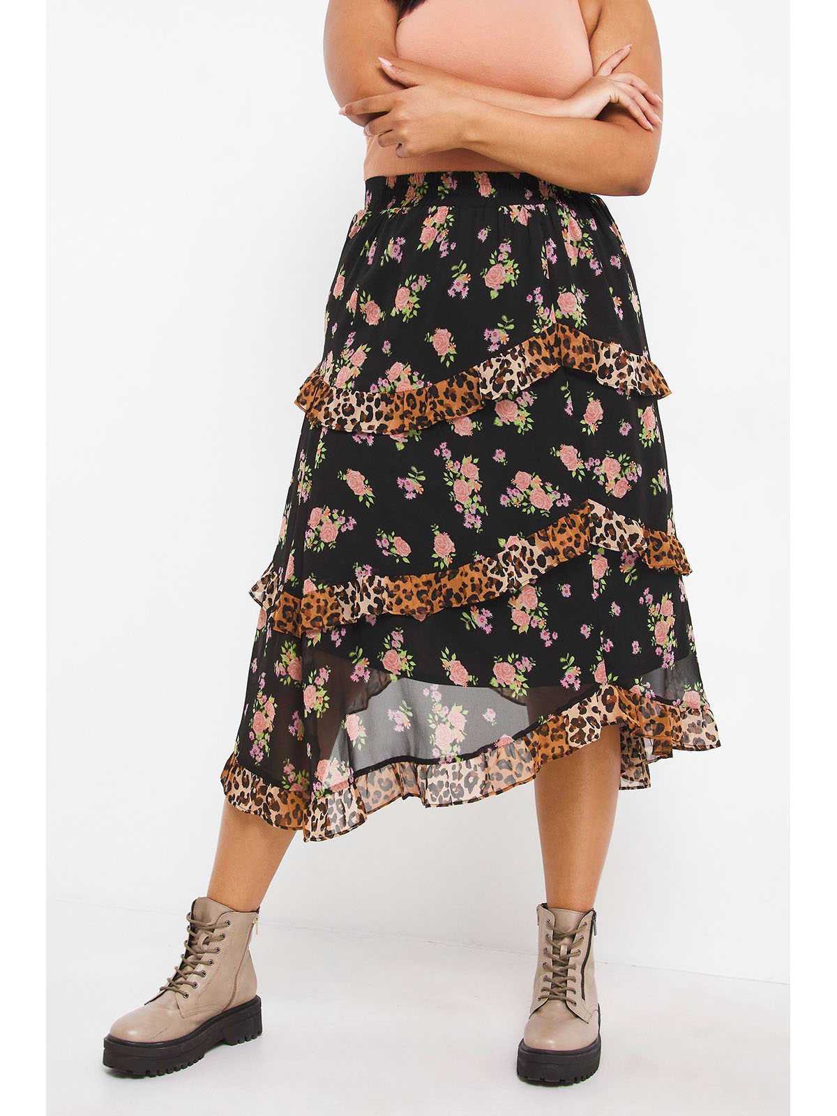 Shop this mixed floral tiered midi skirt in a fabulous leopard and floral print! Featuring a flattering midi length, tiered detail and comfy waistband. Length 32in/82cm.