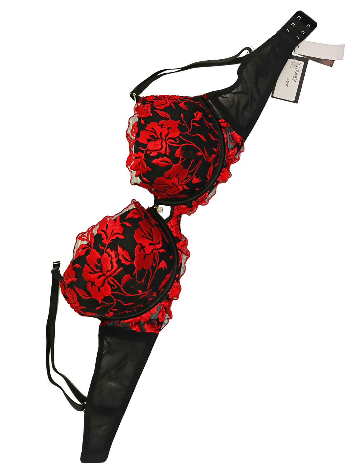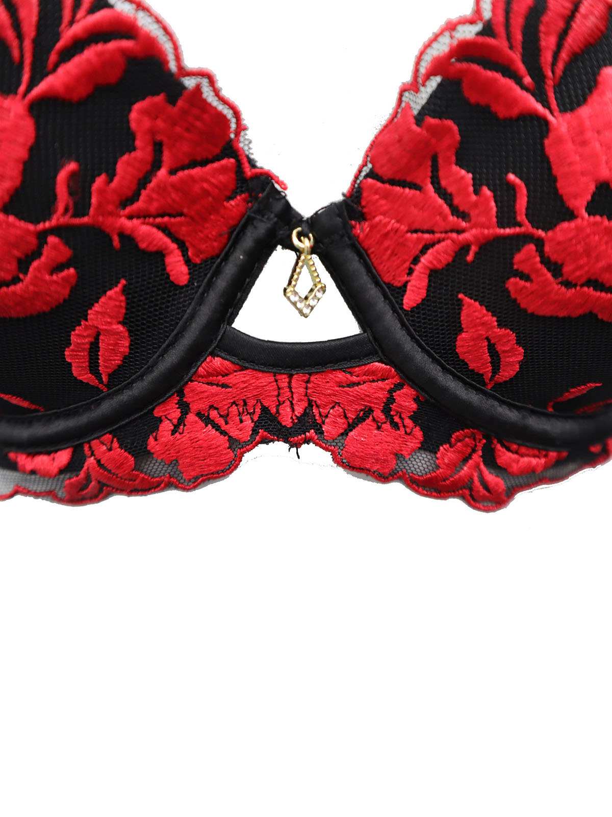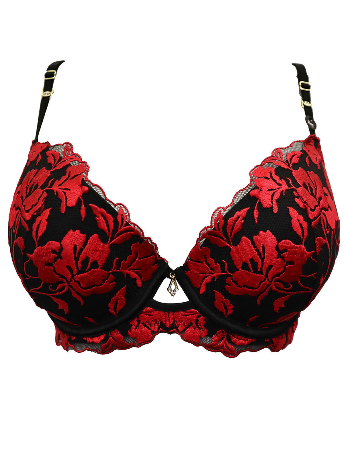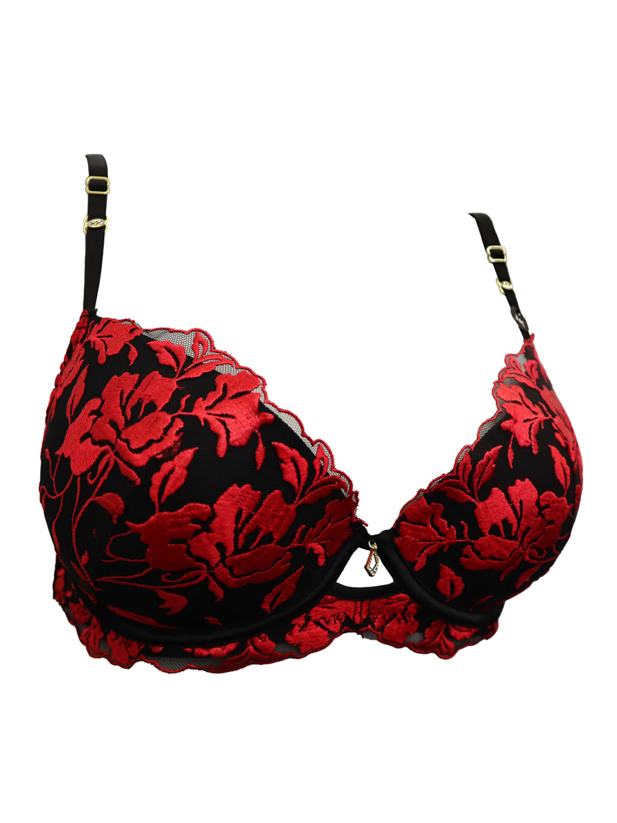 The Hero bra is crafted in a bold and lustrous floral Ciré embroidery with sheer mesh. Beautifully finished with gold hardware with shimmering diamantes. Padded and wired with adjustable straps, rear hook fastening and centre jewel & keyhole detail.