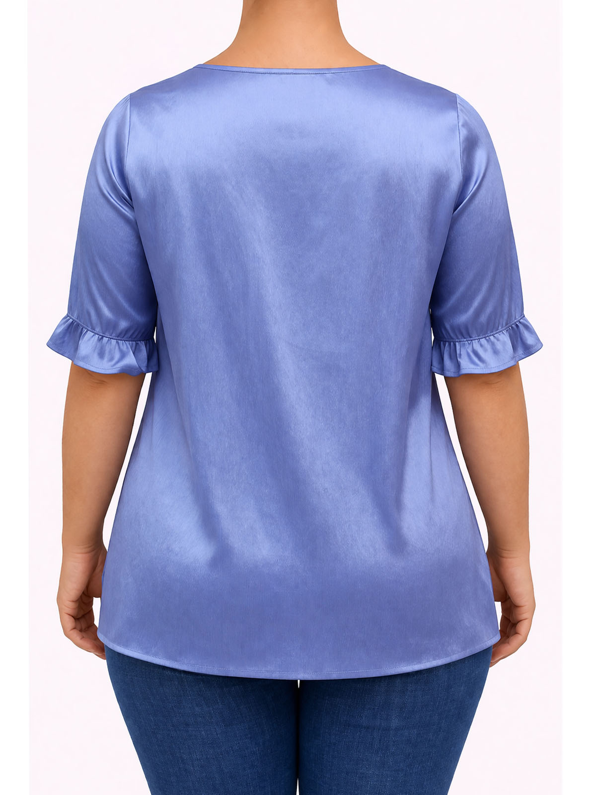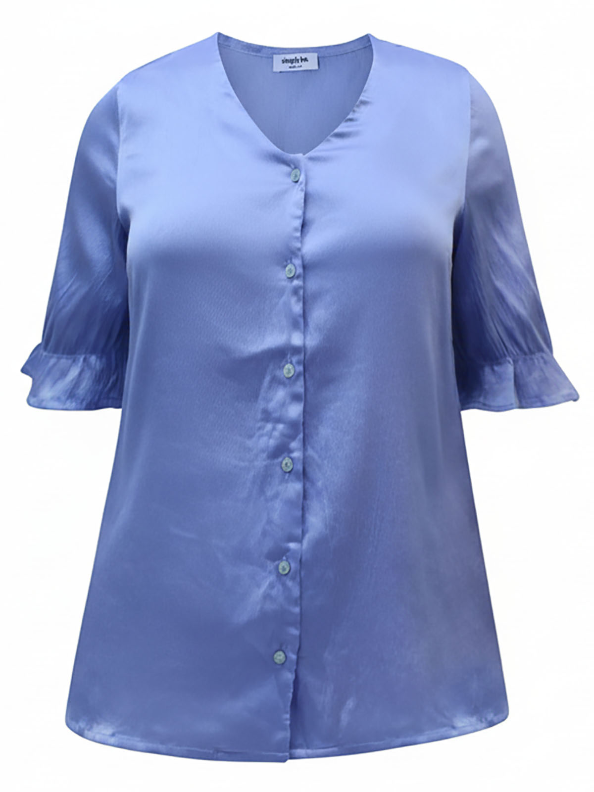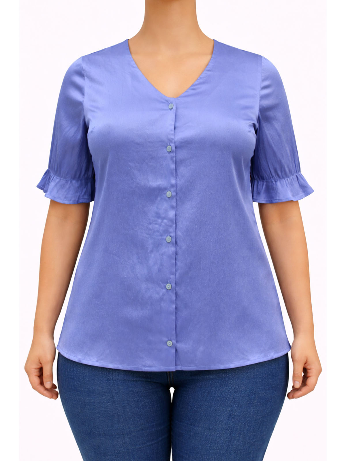 Shop this gorgeous crinkle shirt. Featuring cute puff short sleeves, a lovely crinkle crepe fabric with a subtle sheen and a button through design in a beautiful blue colour! Length 27in/69cm.