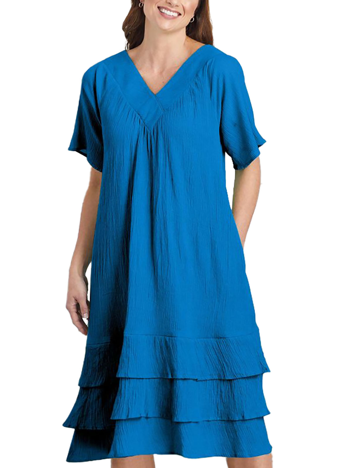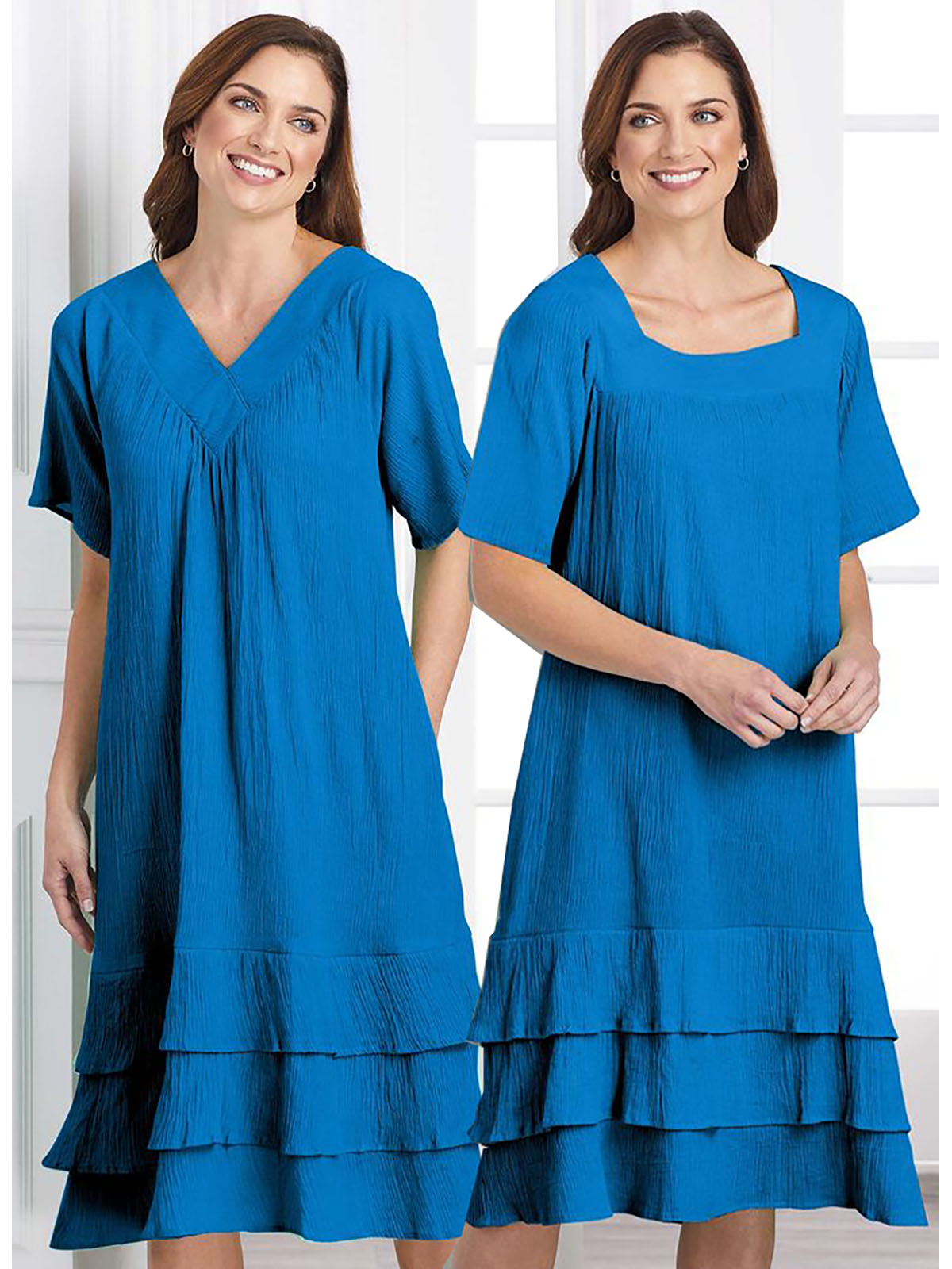 Simply perfect summer dress with options to wear front or back as a square neckline or V-neck. Elbow length flared sleeves. Side seam pockets. Crafted in quality crinkle cotton gauze fabric. Length 42in.