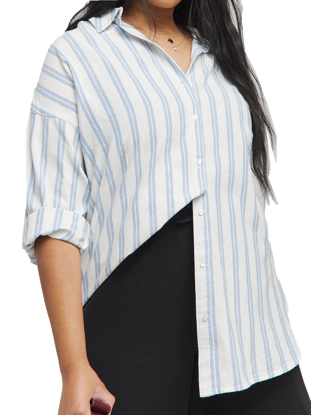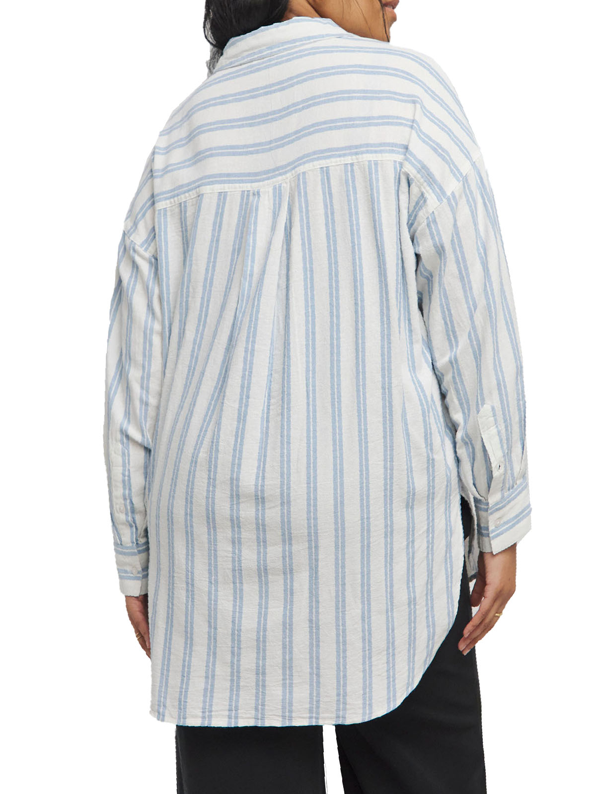 The perfect addition to your wardrobe this season. This premium textured cotton striped shirt features an oversized fit with a dipped back shape. Length 33in.