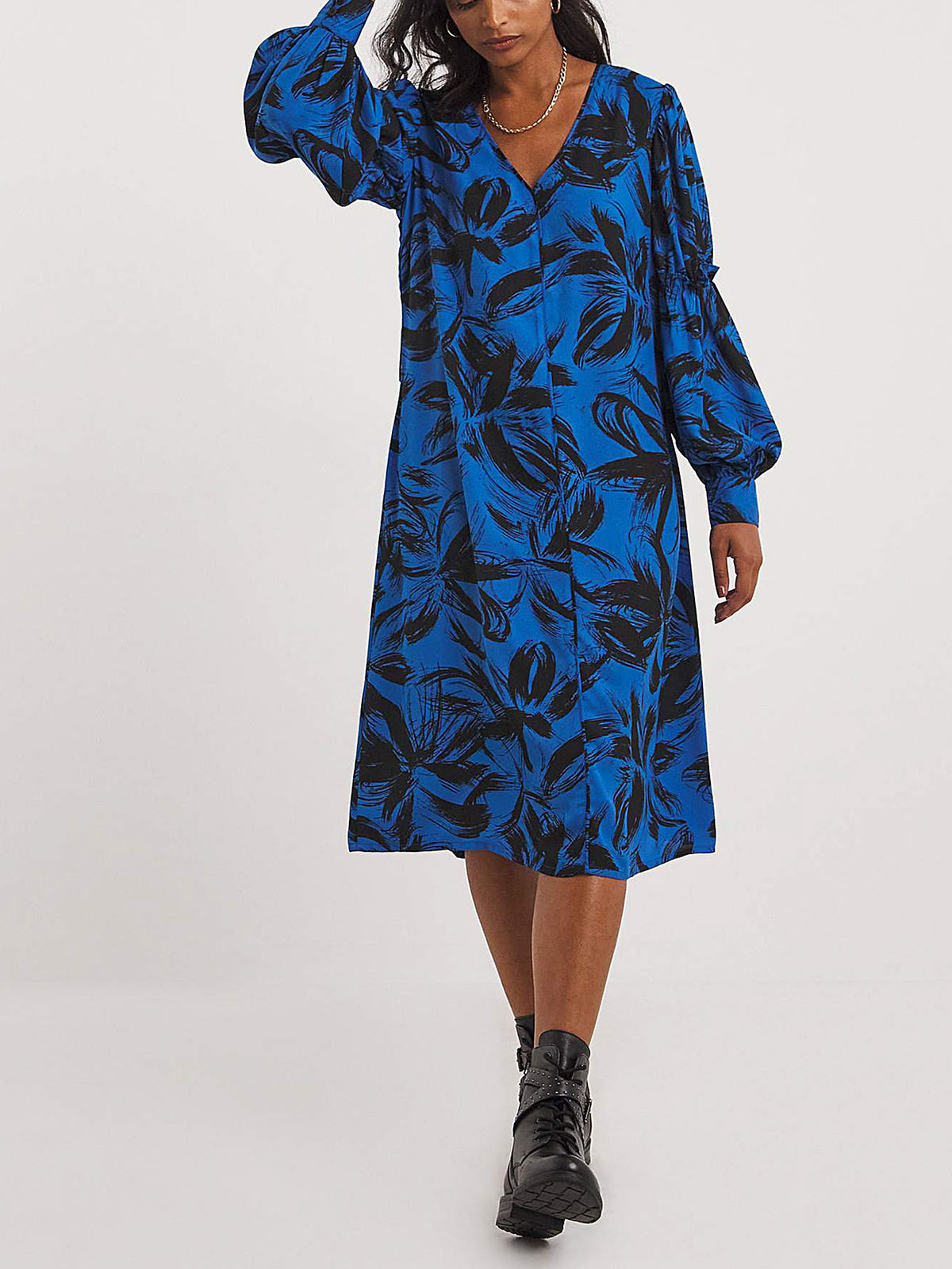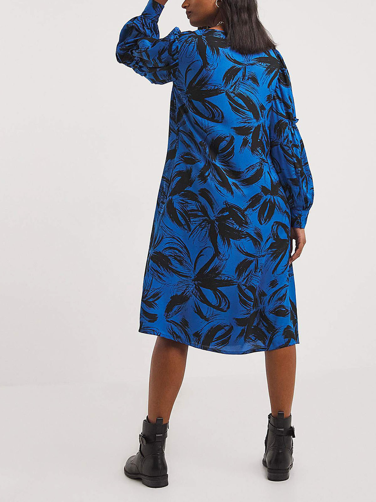 An essential staple for any day styling, this blue and black print dress features a V-neckline, balloon frill sleeves with deep cuffs adding sophistication. Length 39in/99cm.