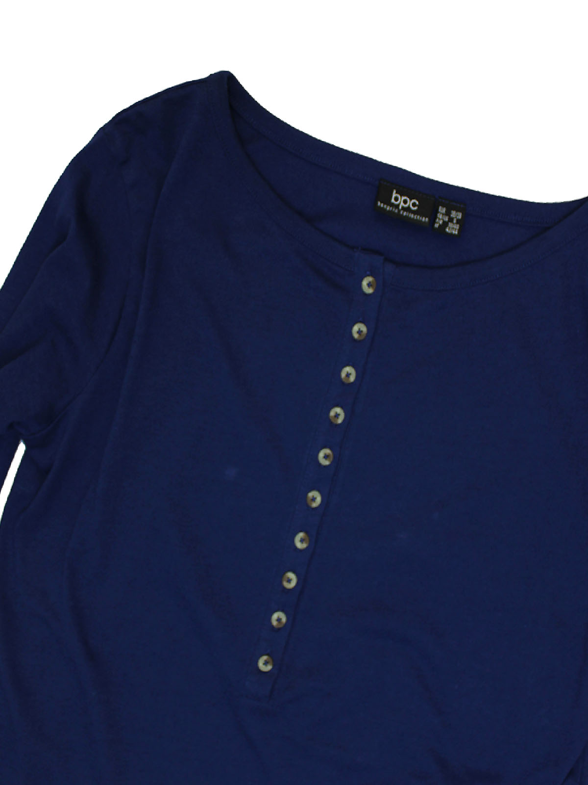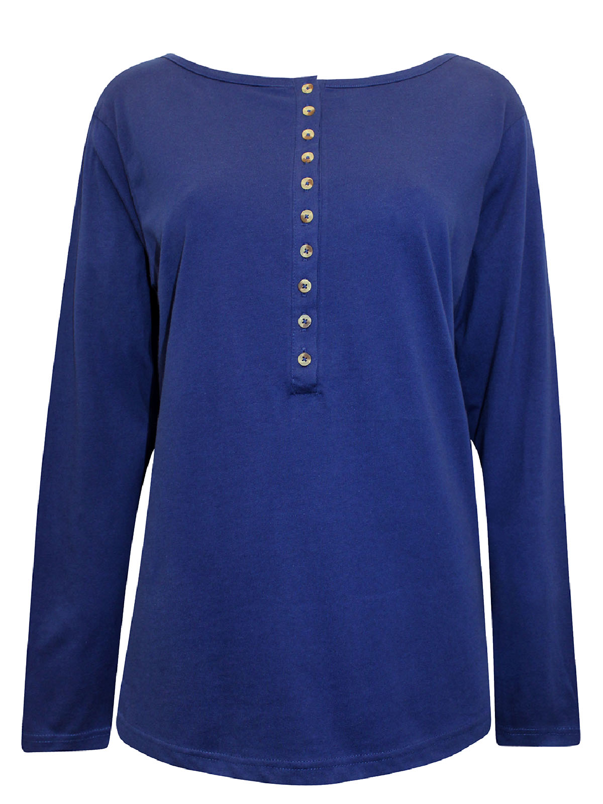 BLUE Pure Cotton Long Sleeve Henley Top - Size 10/12 to 26/28 (S to 2XL)