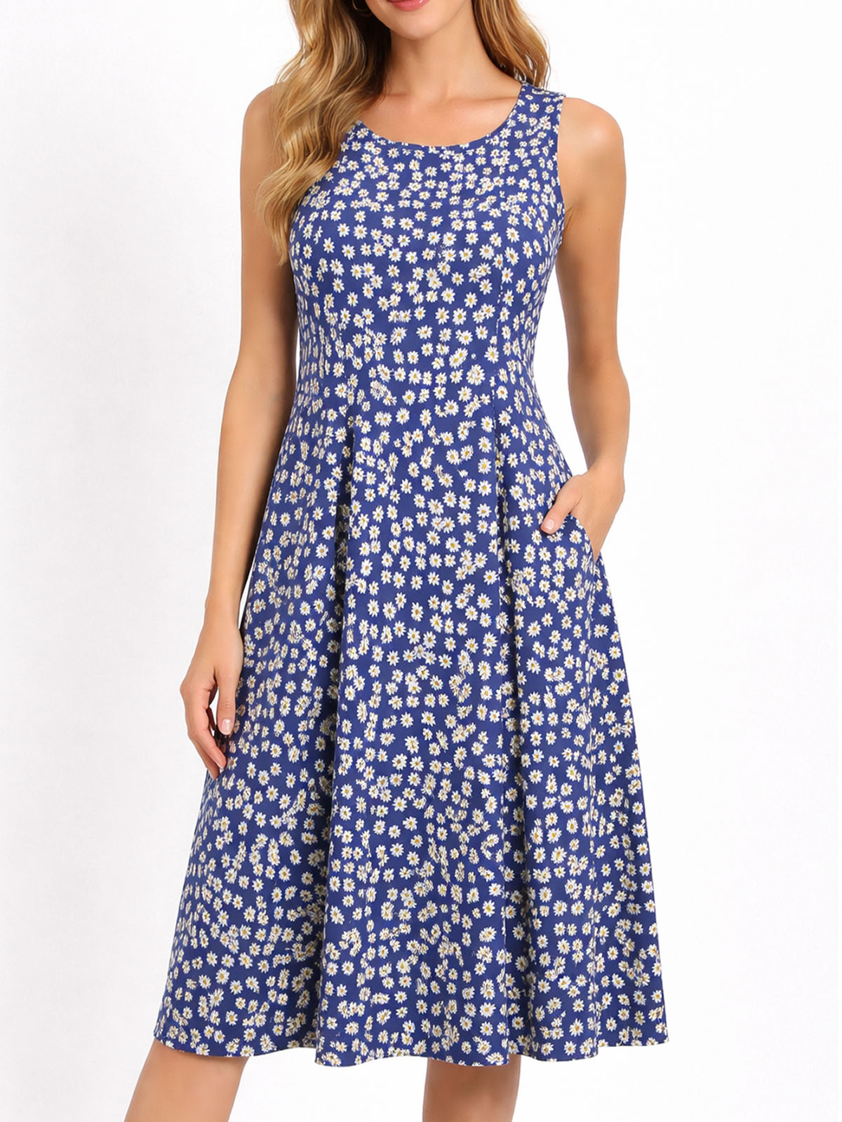 Pure Cotton Sleeveless Floral Print Pocket Swing Dress