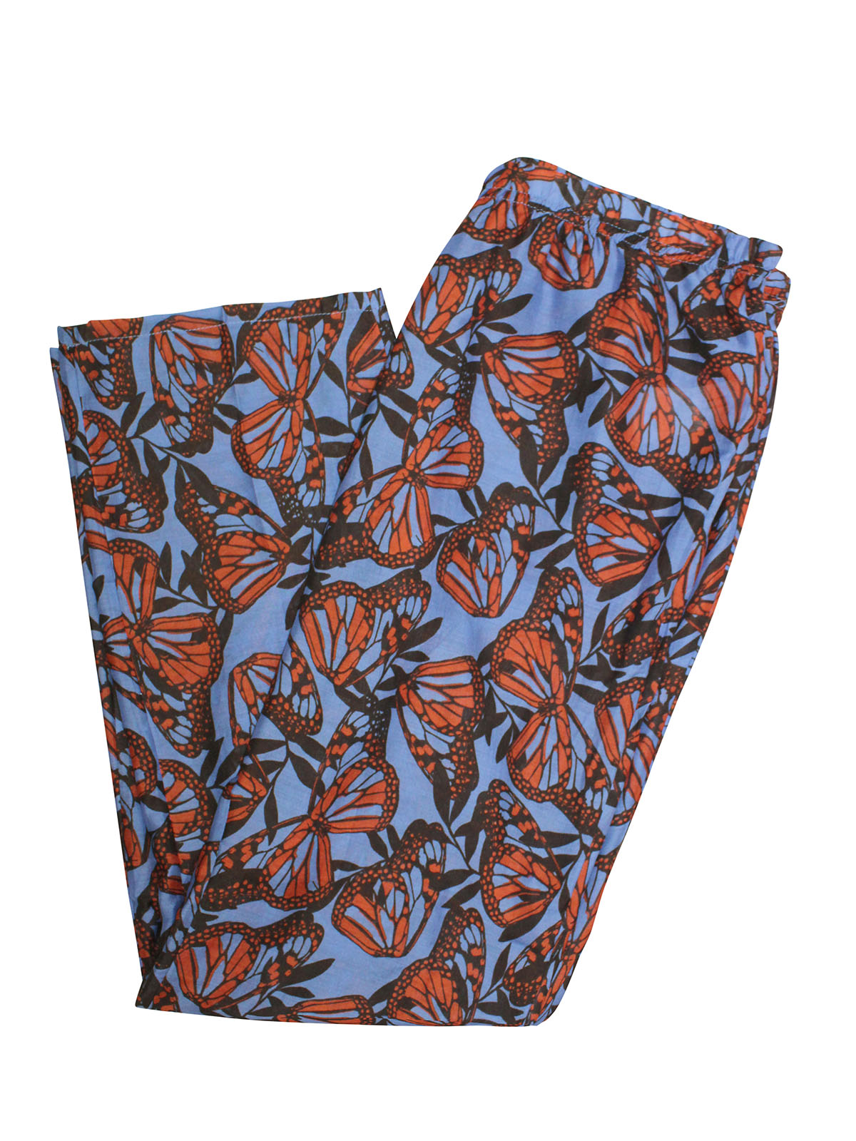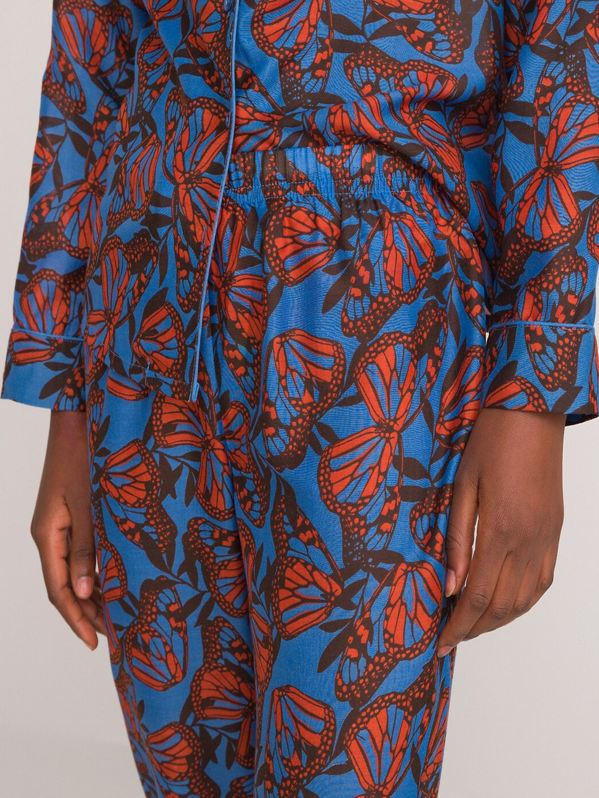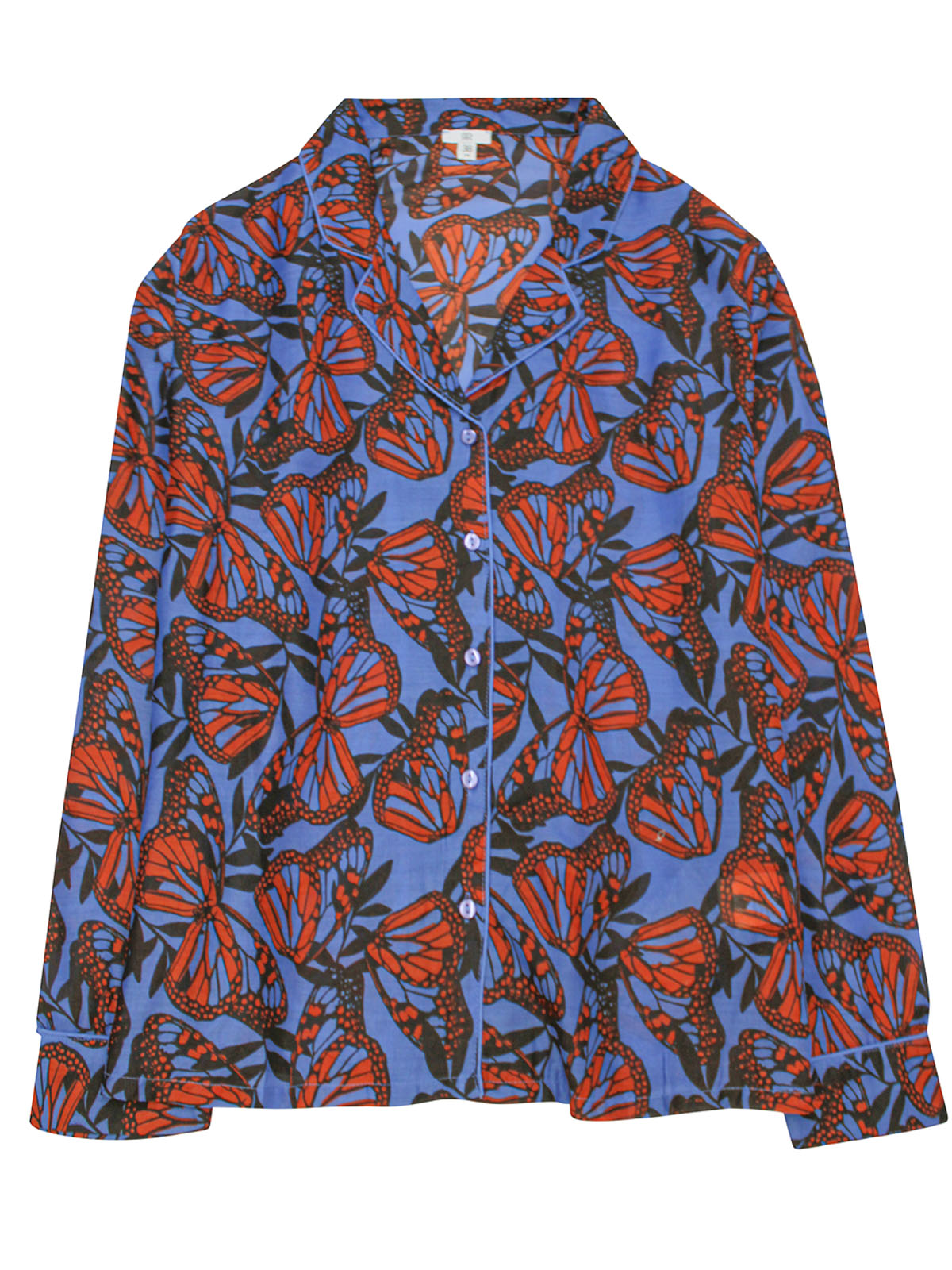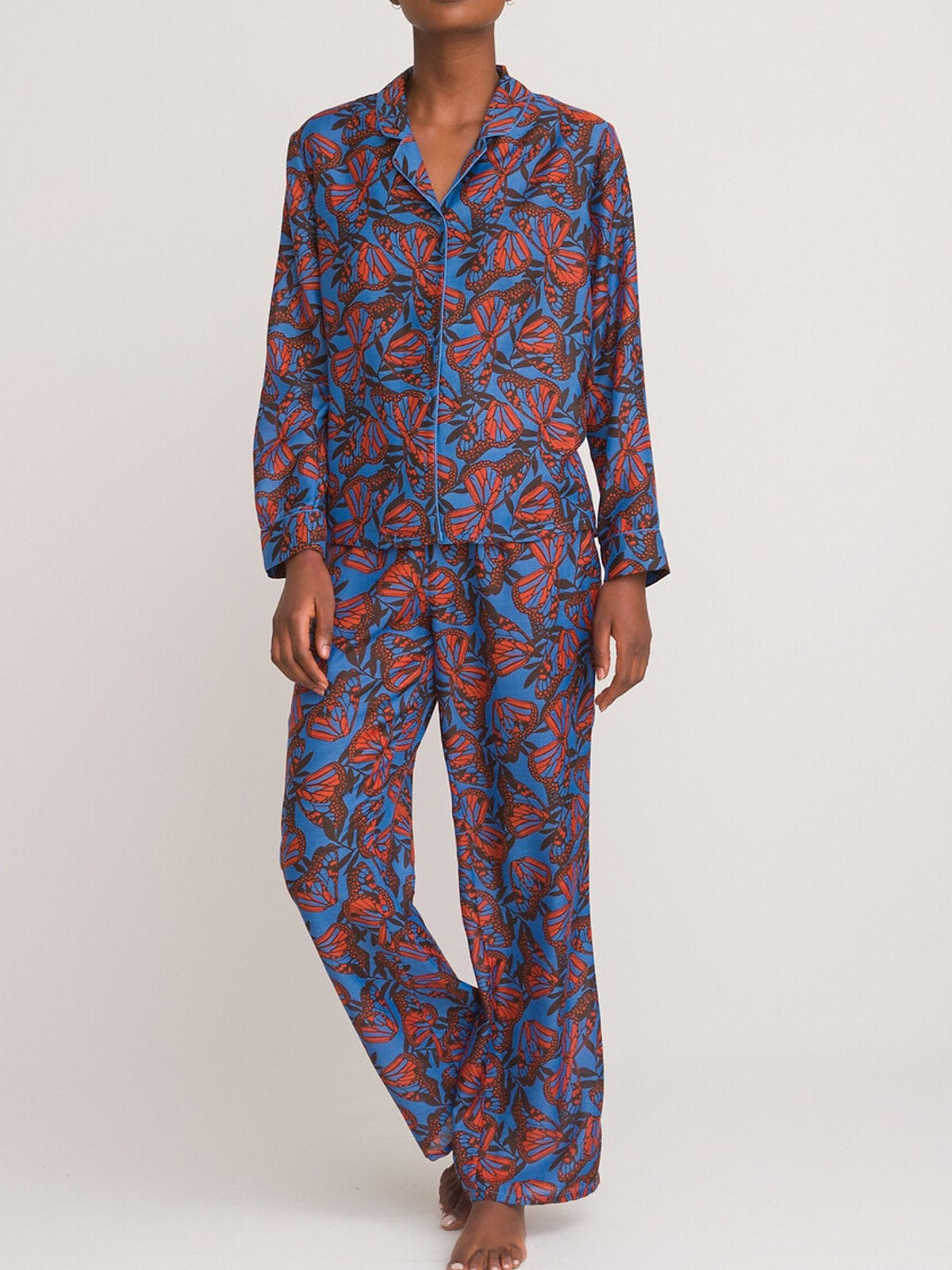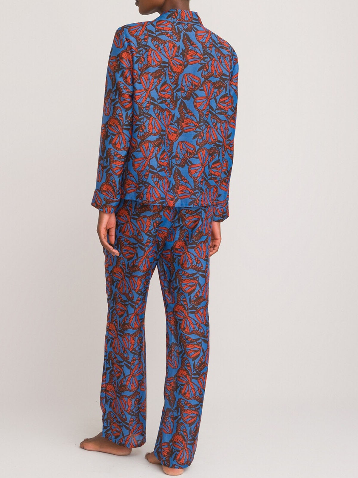 Sleep in style with this butterfly print pyjama set. Made from a comfortable woven fabric, it features long sleeves and a classic collared design. Matching bottoms with an elasticated waist. Top length 24in.