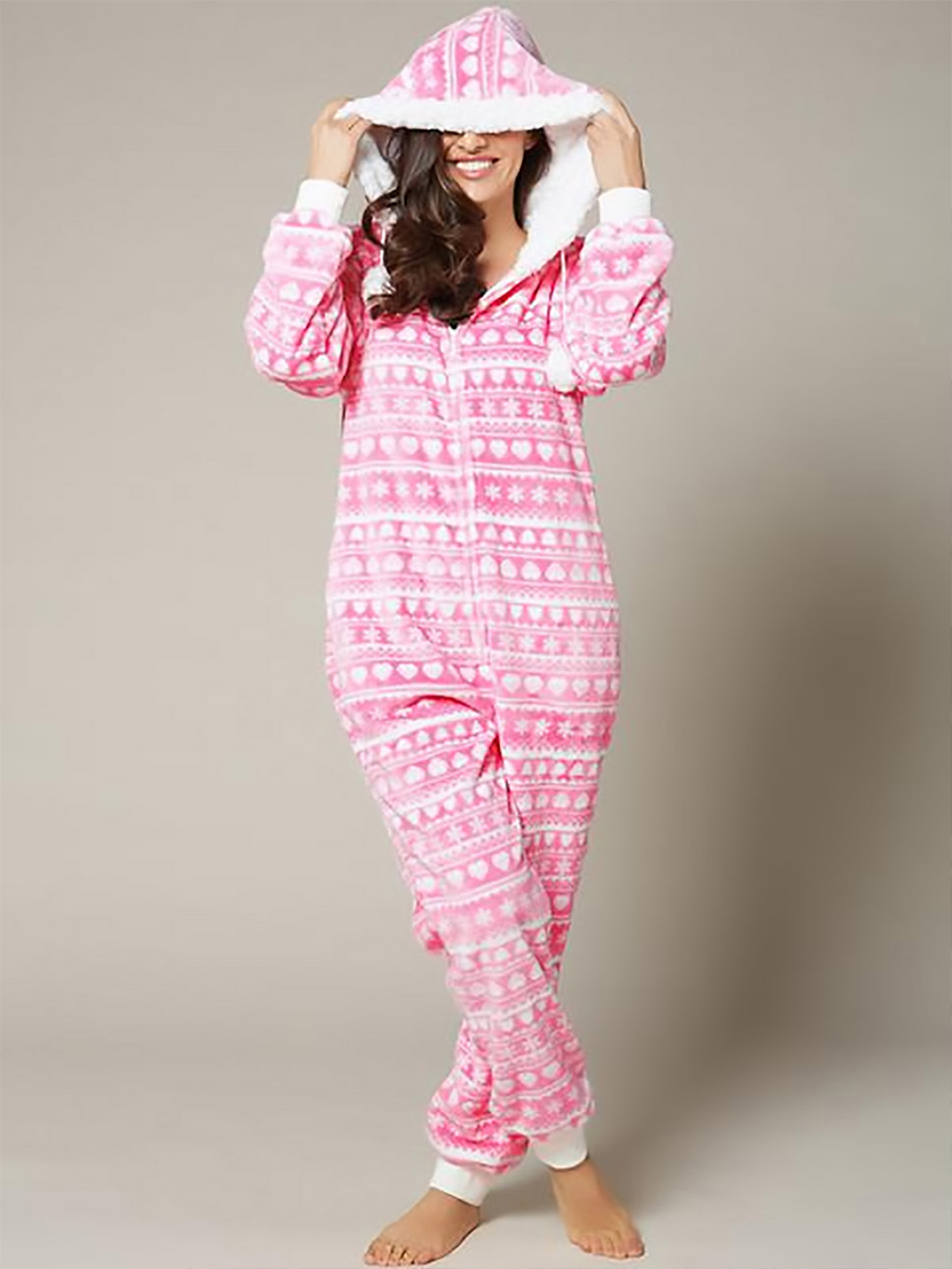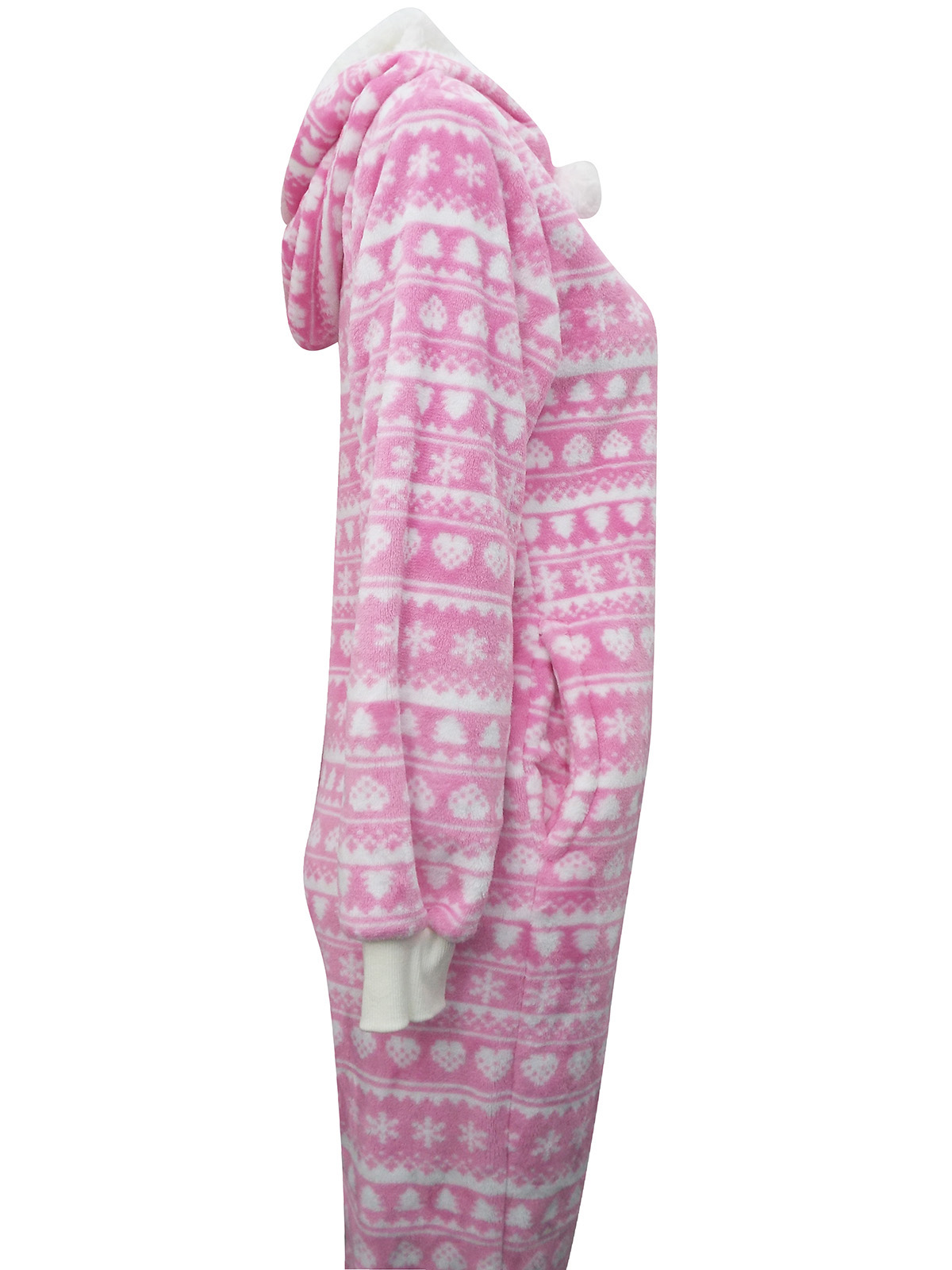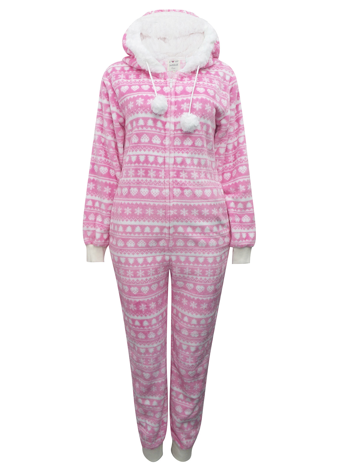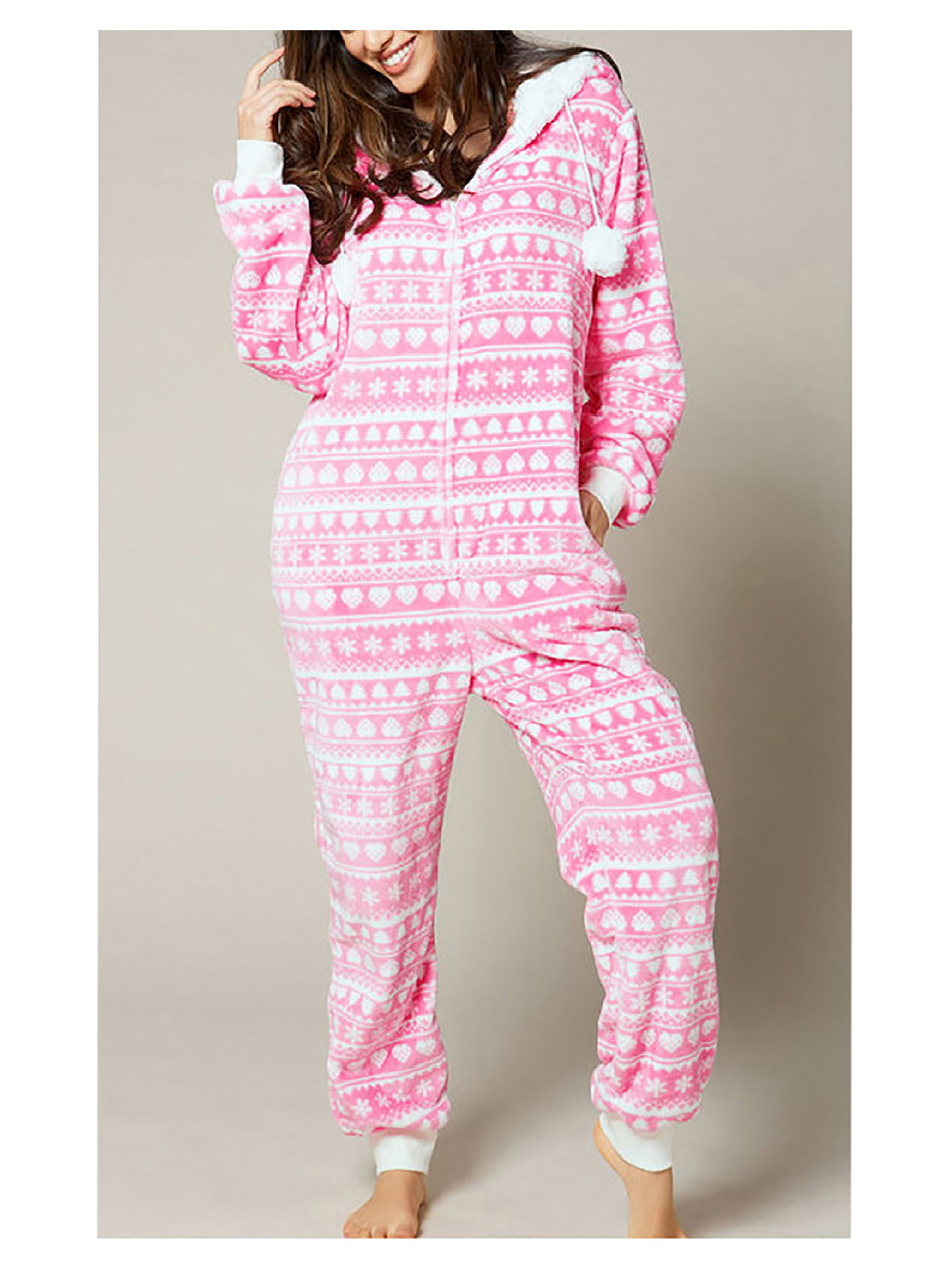 Cosy up for the transitional season in this super soft onesie. In a pink and white fairisle print. Hooded with pom pom details and a front zip fastening.