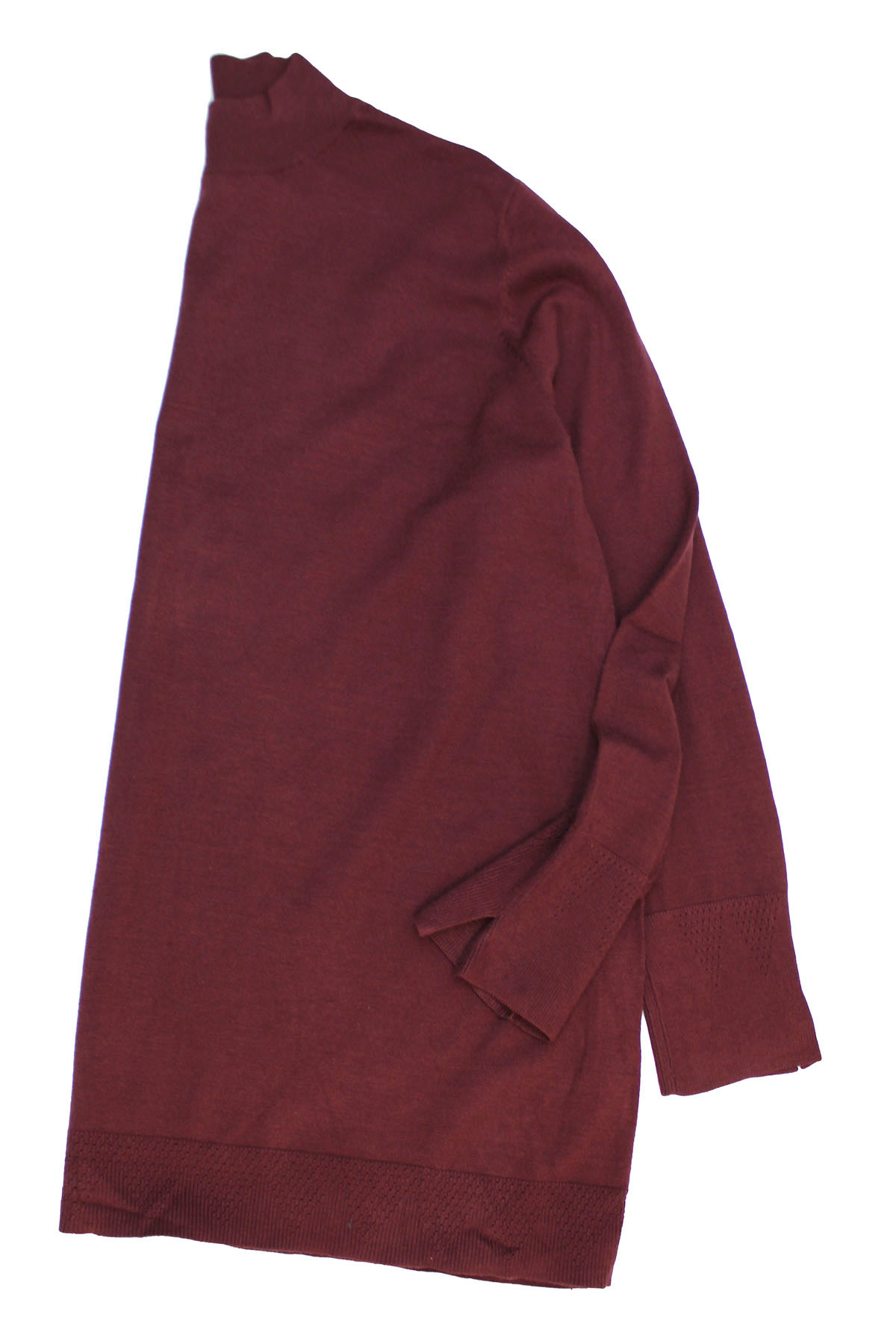 Soft knit jumper with a good weight and natural stretch. this jumper features a funnel neckline, long sleeves with subtle pointelle texture trim at split cuffs and hem. Length 28in.