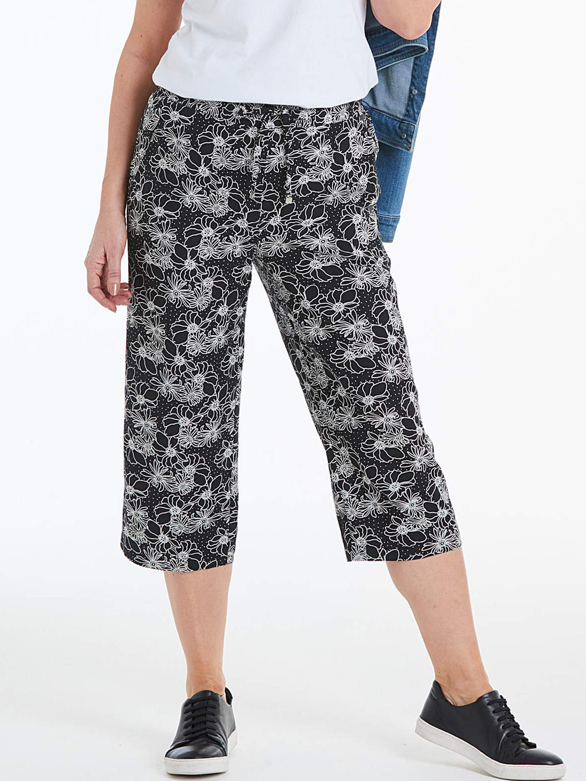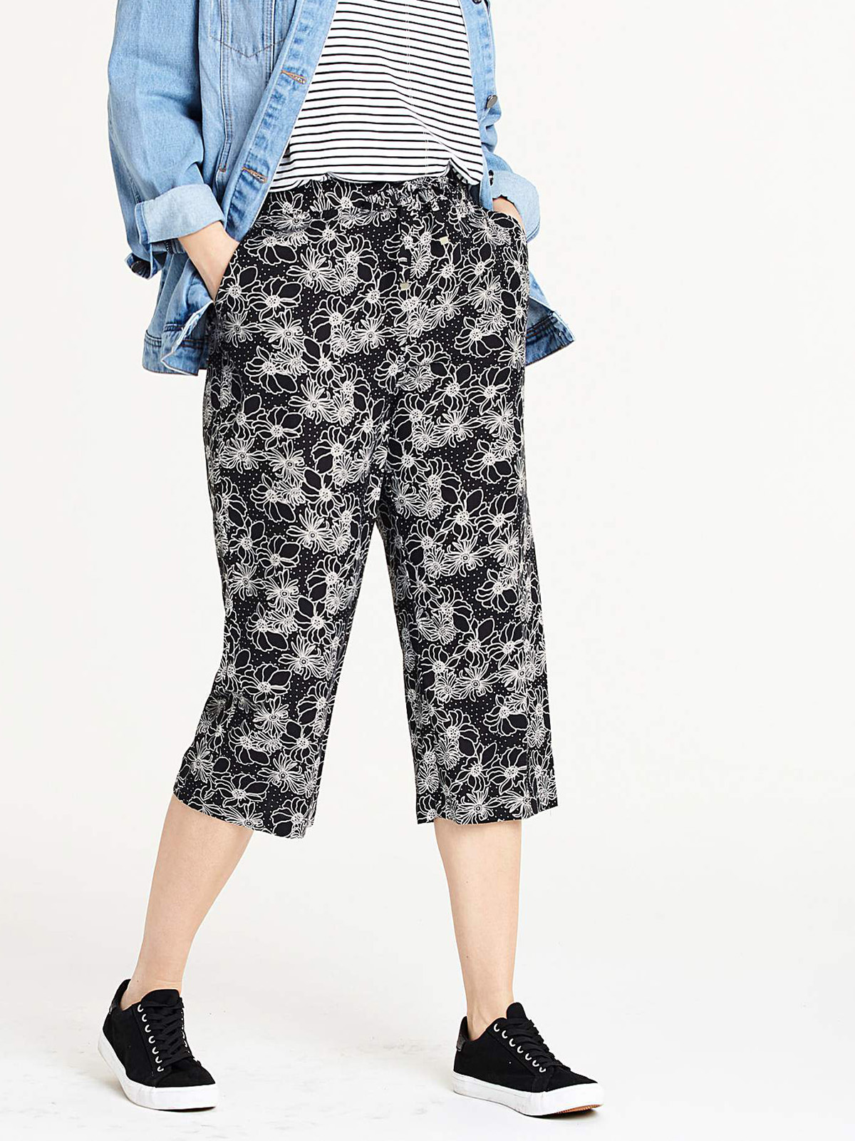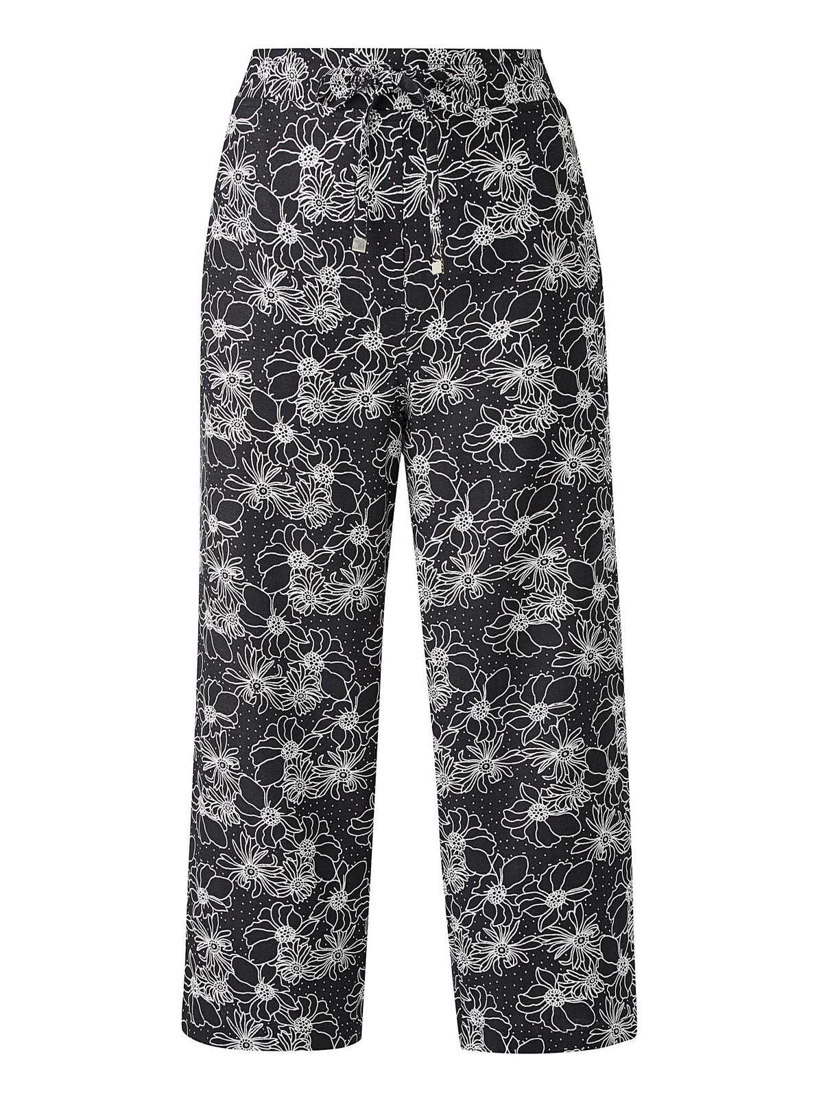 Soft linen mix fabric in a feminine floral print design. Back elasticated waist for fit and adjustable drawcord. Two front pockets. Easy pull on style. Inside leg lengths: Petite 19in. Regular 19in.
