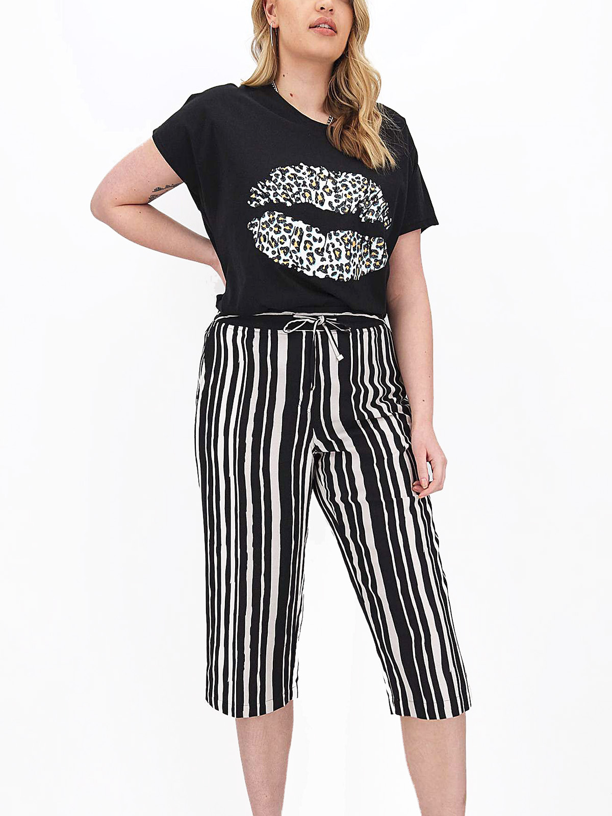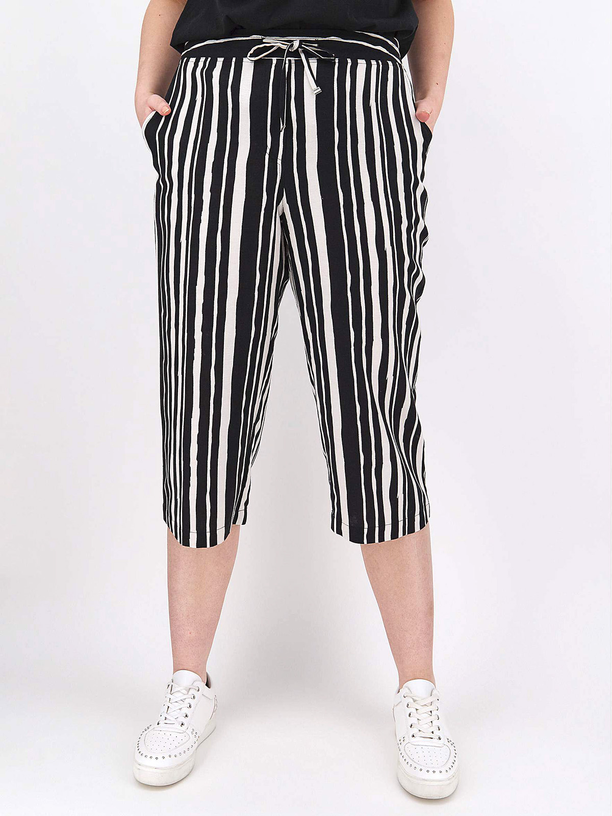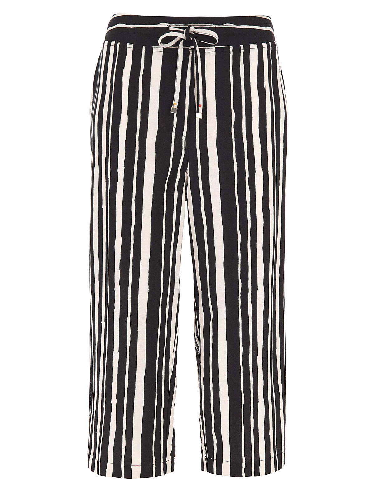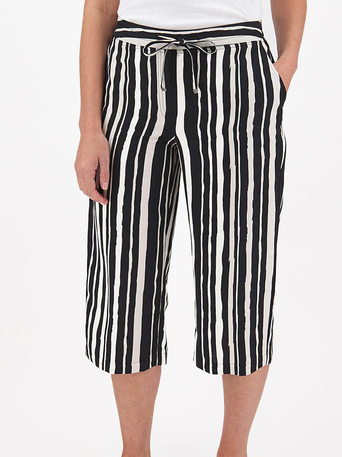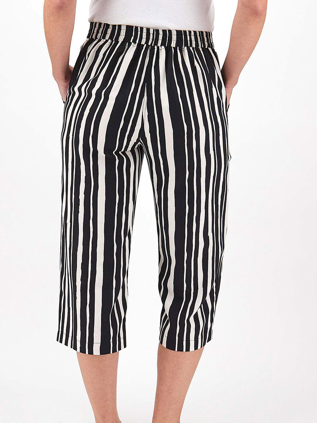 These cropped trousers are a go-to for smart or casual styling. They feature a back elasticated waist for fit and a flat front with an adjustable drawcord. Soft linen mix fabric in a great vertical stripe design. Two front pockets. Easy pull-on style.
