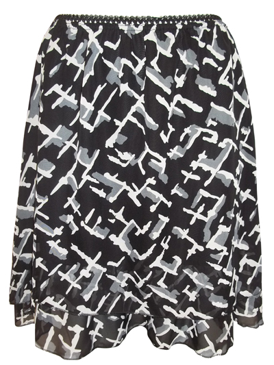This plus size skirt has an elasticated waistband with a scallop lace trim. Made from a printed chiffon fabric and fully lined. Length 19.5"