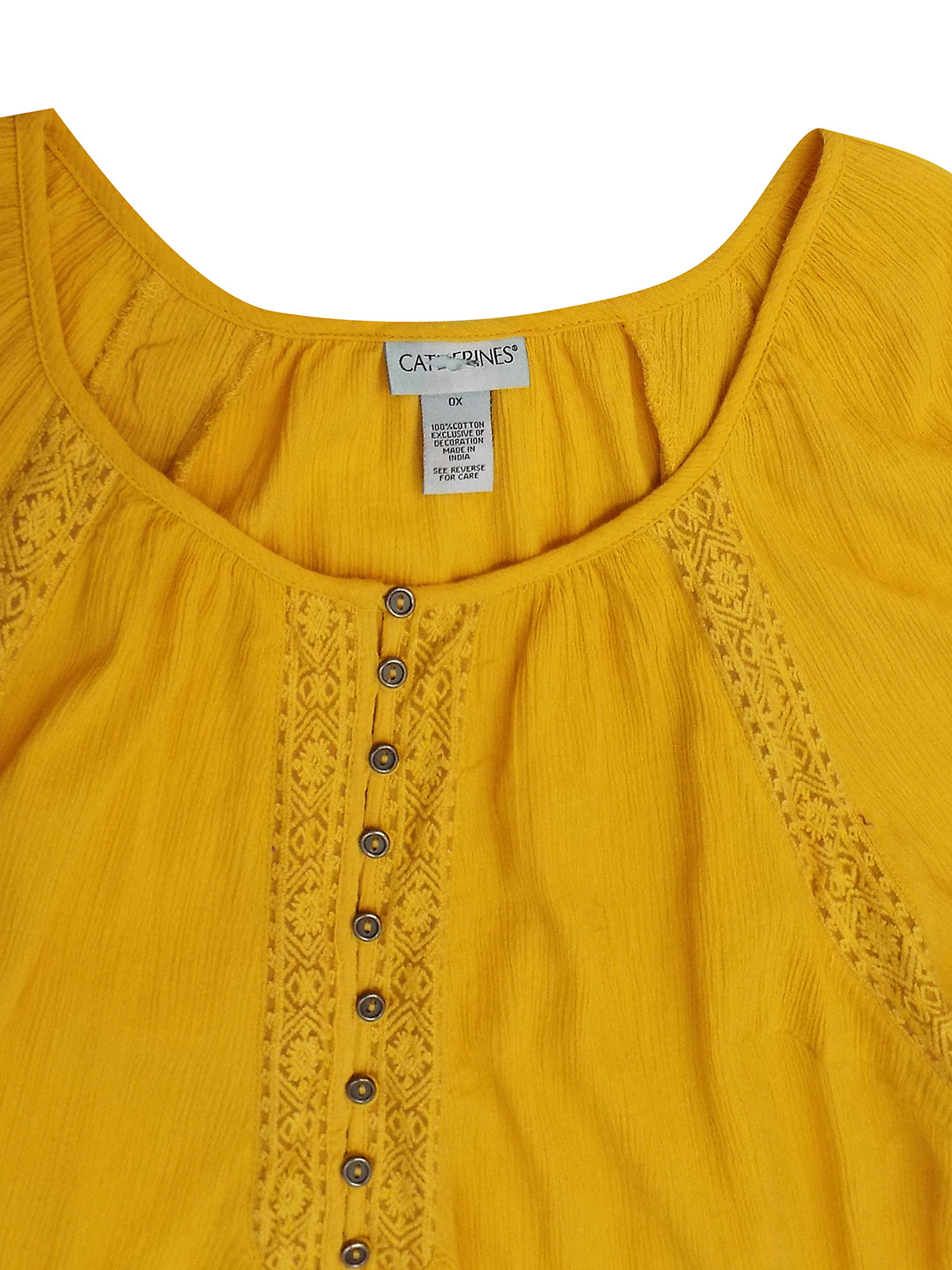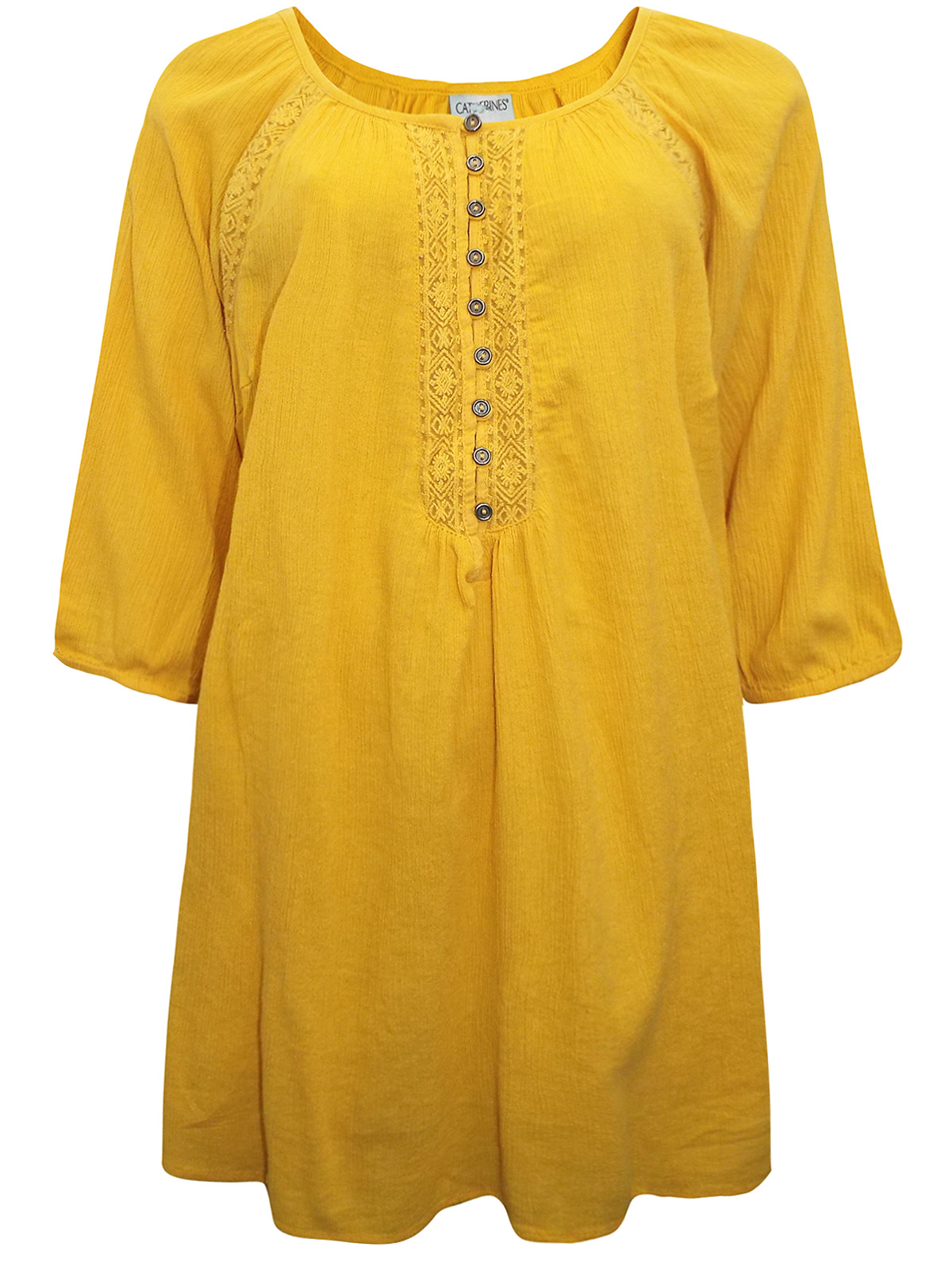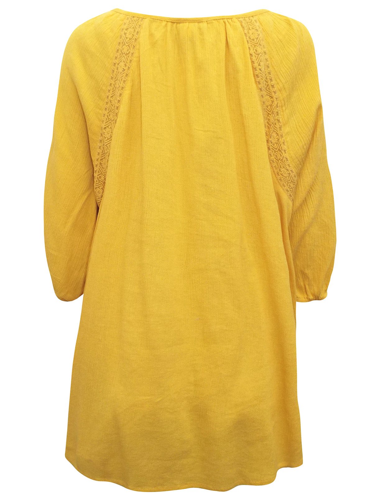 Embrace mustard this season with this crinkle top. Ideal for the warmer weather, it is woven from a crinkle fabric and features 3/4 length sleeves with elasticated cuffs and embroidery details. Length 31in.